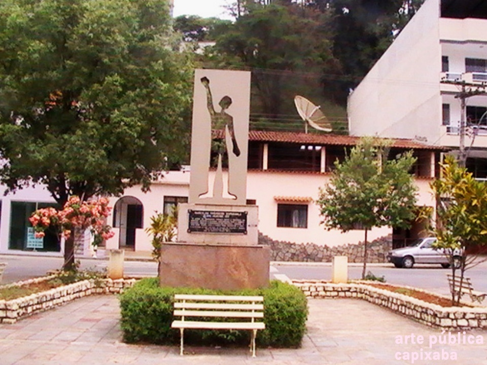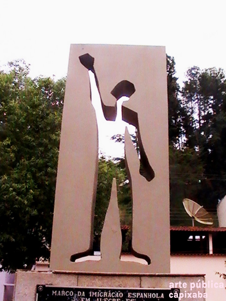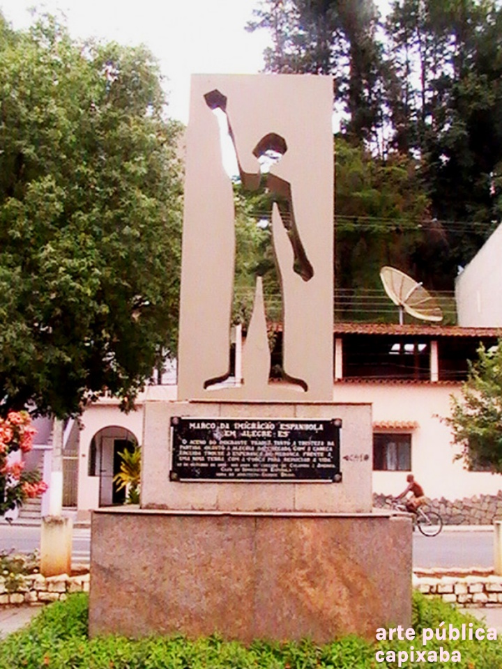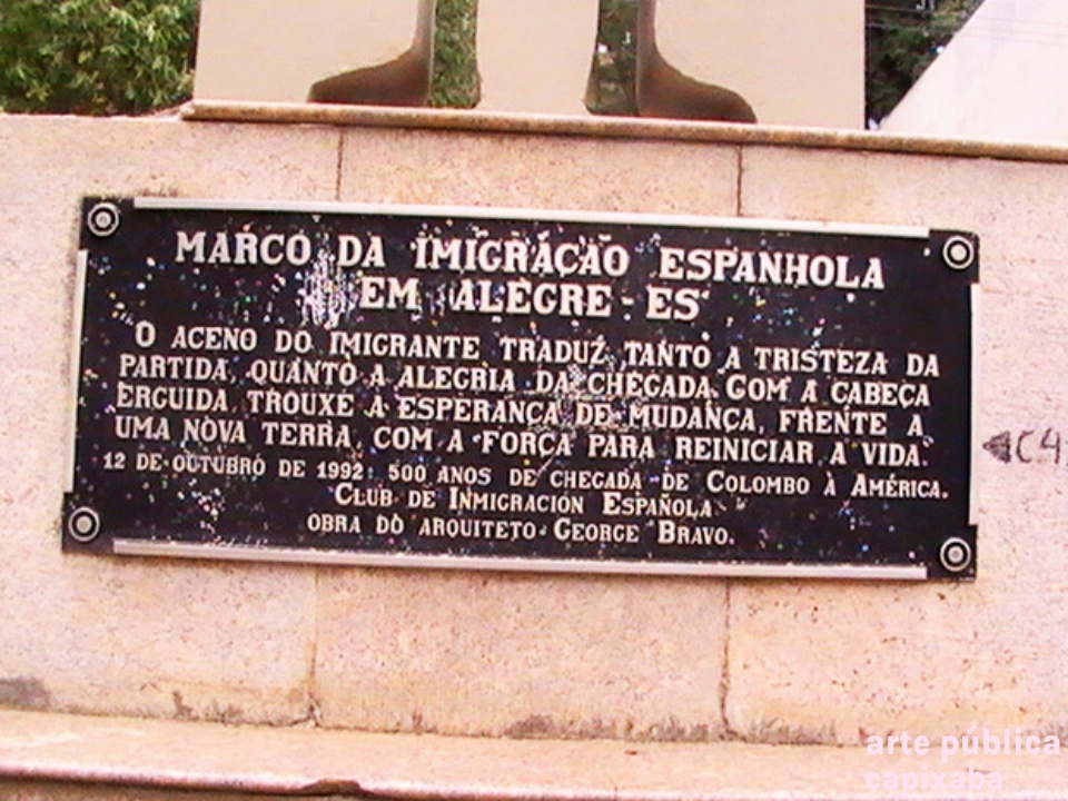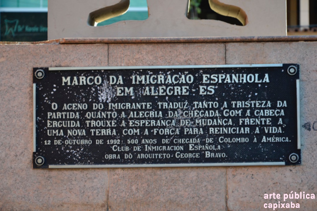 Lê-se: "Marco da Imigração Espanhola em Alegre-ES / "O aceno do imigrante traduz tanto a tristeza da partida, quanto a alegria da chegada. Com a cabeça erguida, trouxa a esperança de mudança, frente a uma nova terra, com a força para reiniciar a vida." / 12 de outubro de 1992: 500 anos de chegada "e Colombo à América. Club de Inmigración Española / Obra do arquiteto George Bravo."