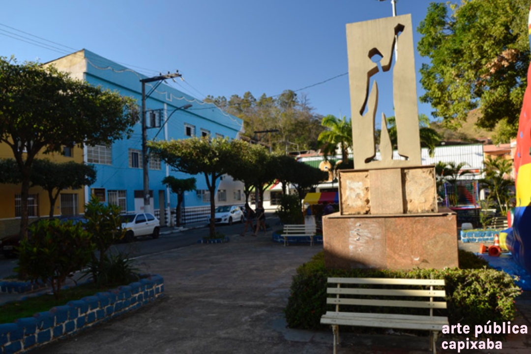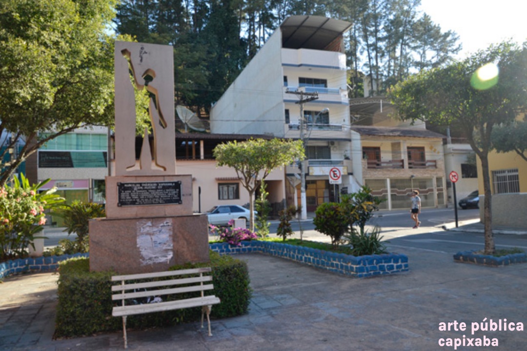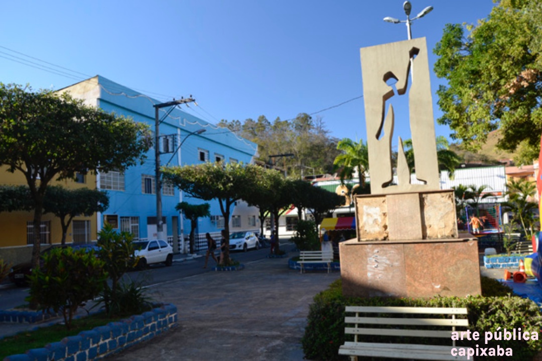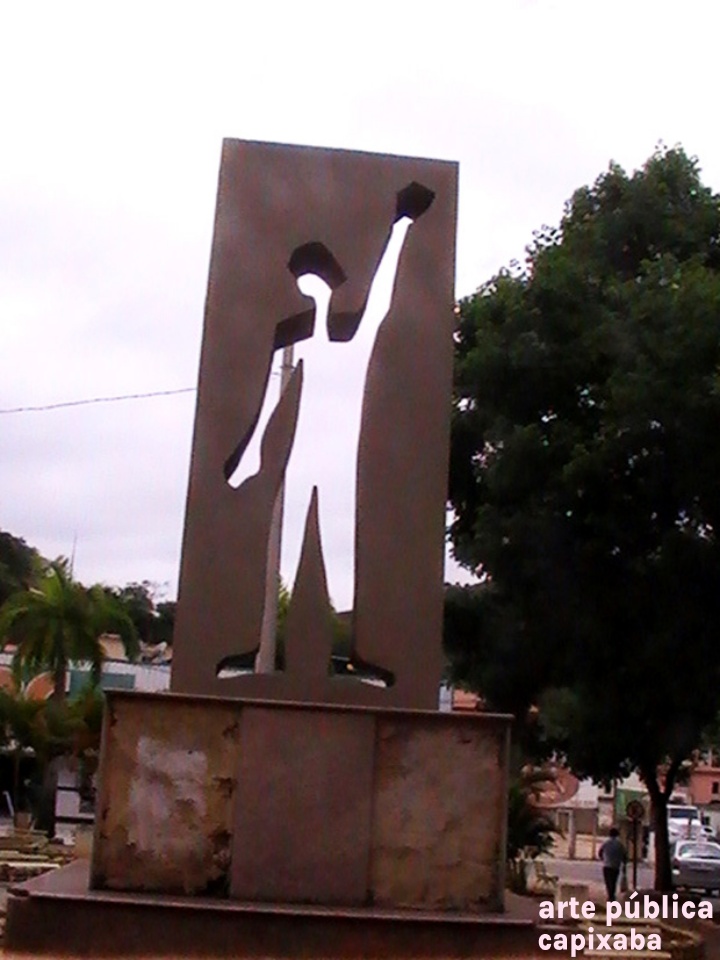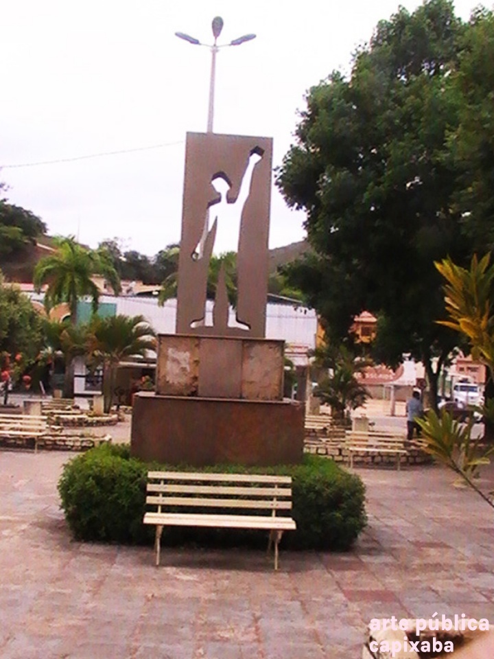 Lê-se: "Marco da Imigração Espanhola em Alegre-ES / "O aceno do imigrante traduz tanto a tristeza da partida, quanto a alegria da chegada. Com a cabeça erguida, trouxa a esperança de mudança, frente a uma nova terra, com a força para reiniciar a vida." / 12 de outubro de 1992: 500 anos de chegada "e Colombo à América. Club de Inmigración Española / Obra do arquiteto George Bravo."
