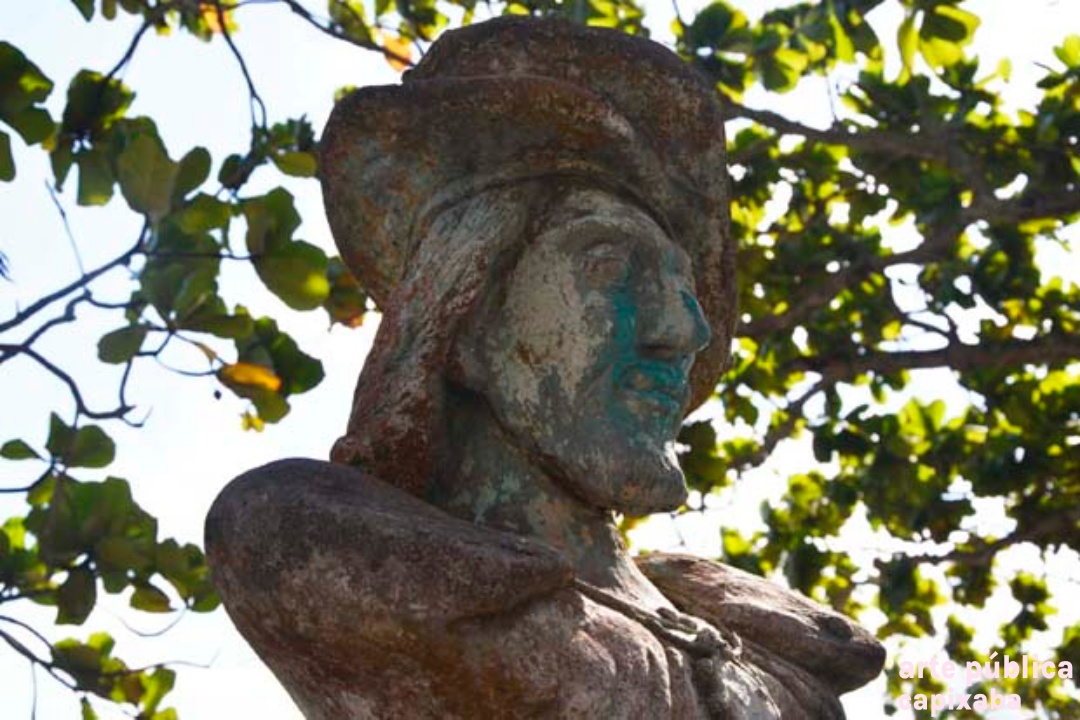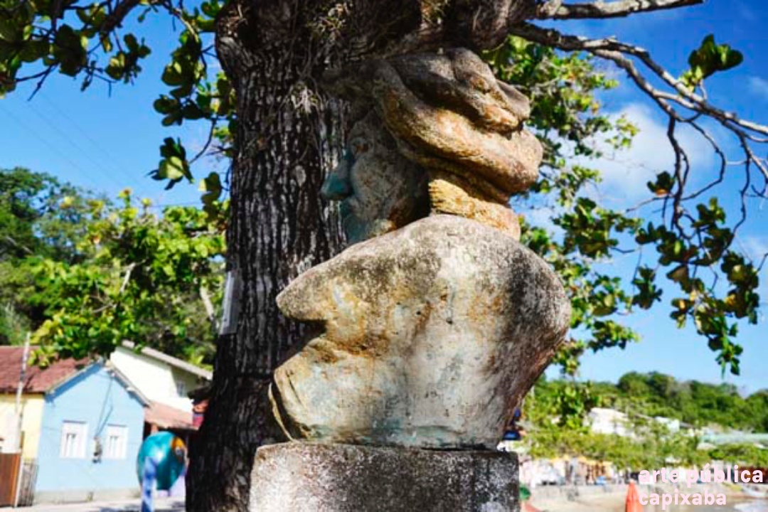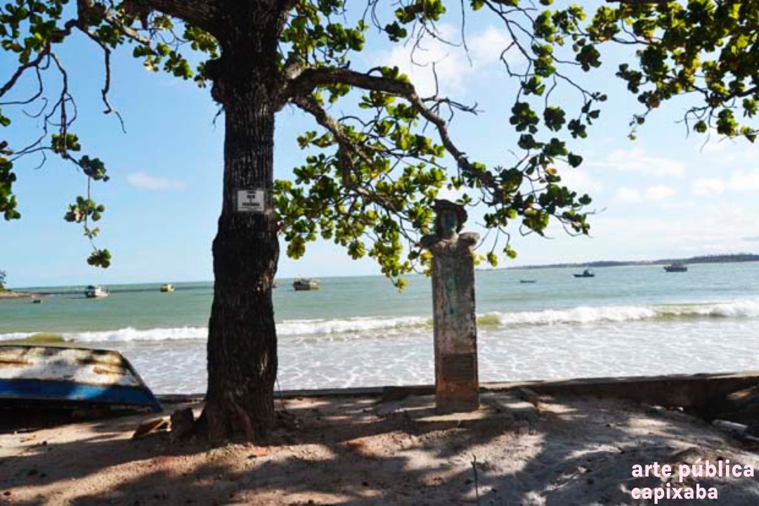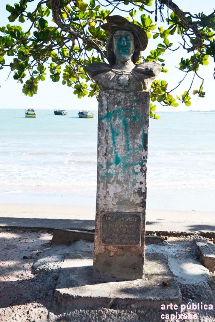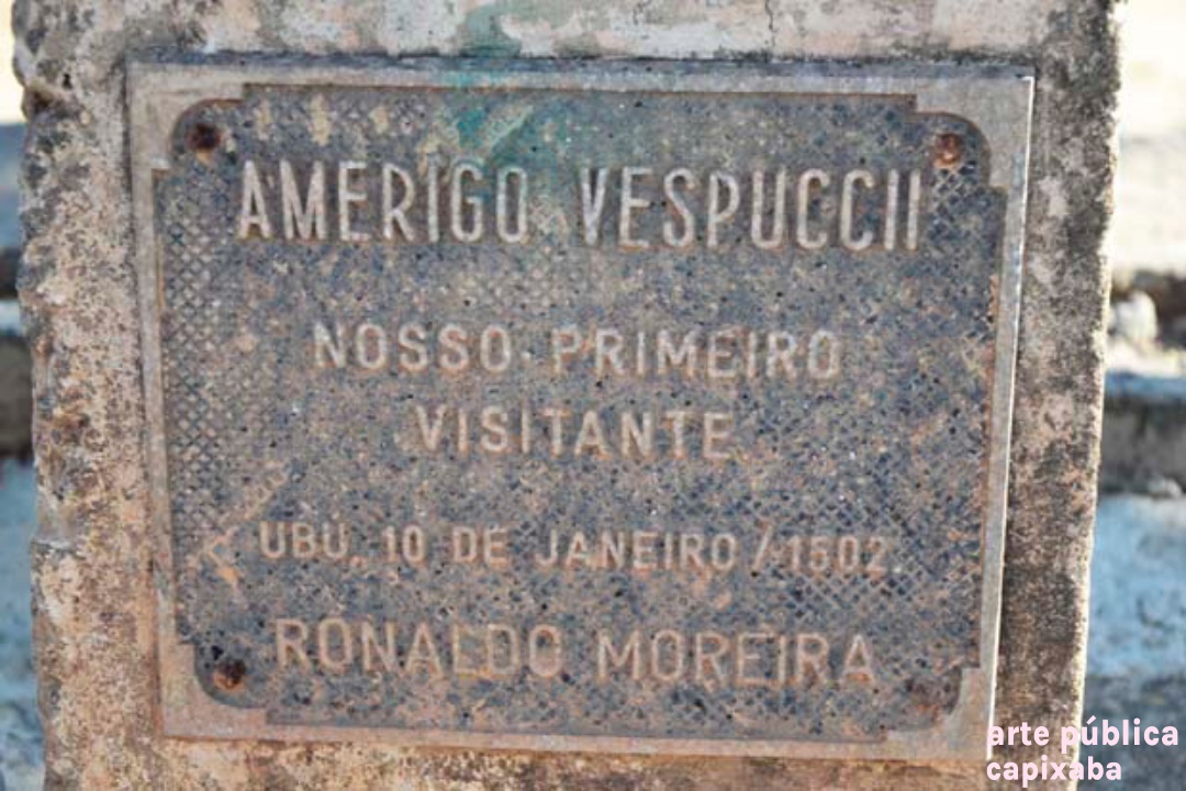 Lê-se: " Amerigo Vespuccii Nosso primeiro visitante Ubu, 10 de janeiro de 1502 Ronaldo Moreira"