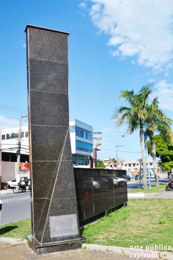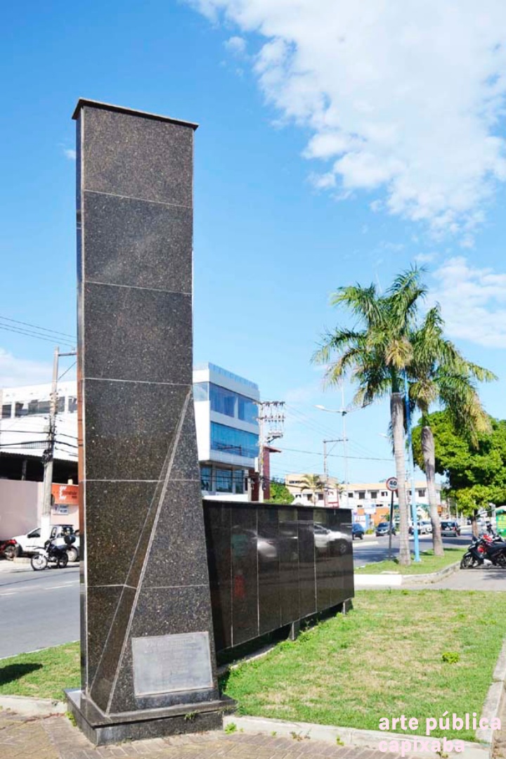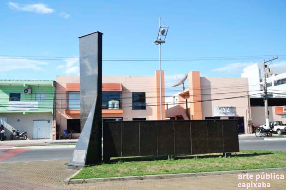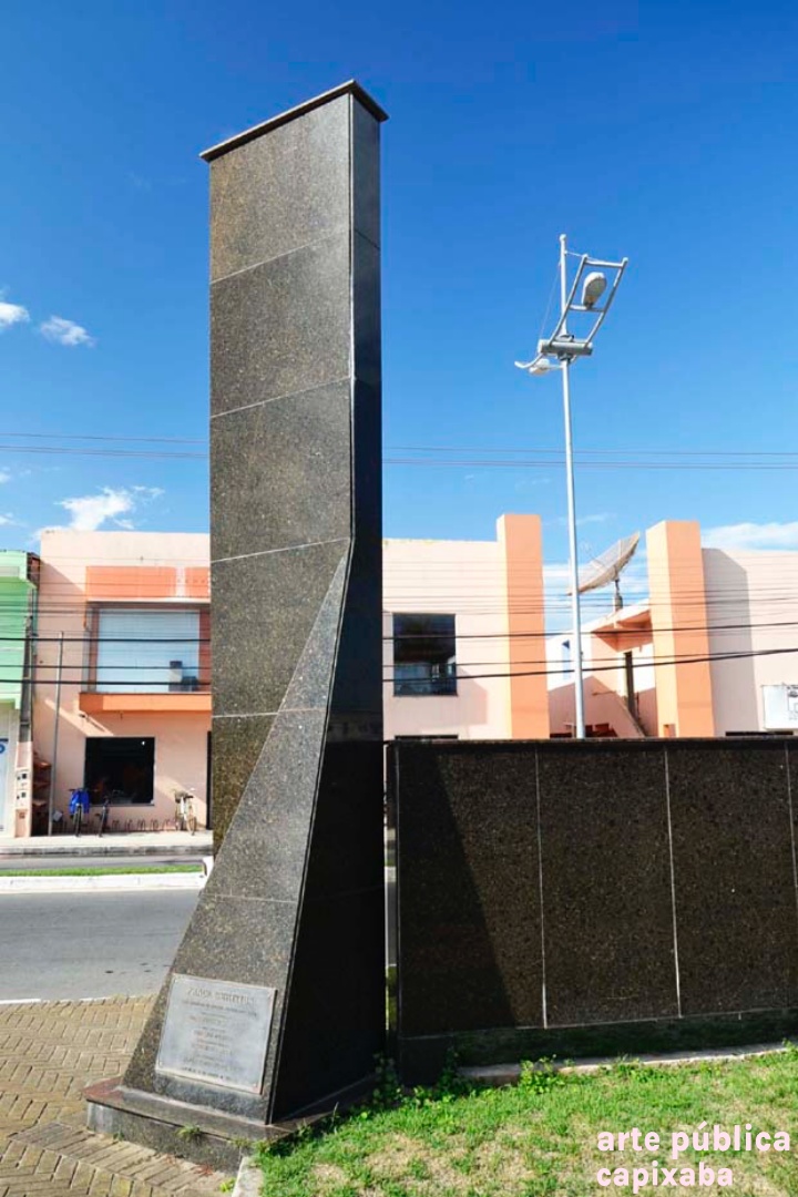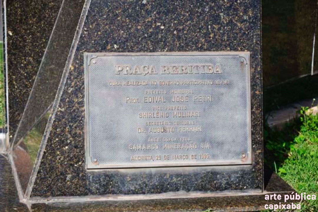 Lê-se: "PRACA RERITIBA OBRA REALIZADA NO GOVERNO PARTICIPATIVO ... PREFEITO MUNICIPAL PROF. EDIVAL JOSE PETRI VICE PREFEITO SHIRLÊNIO MULINARI SECRETARIO DE OBRAS DR AUSUSTO FERRARI ÁREA DOADA PELA SAMARCO MINERAÇÃO S/A ANCHIETA, 25 DE MARÇO DE 1995"