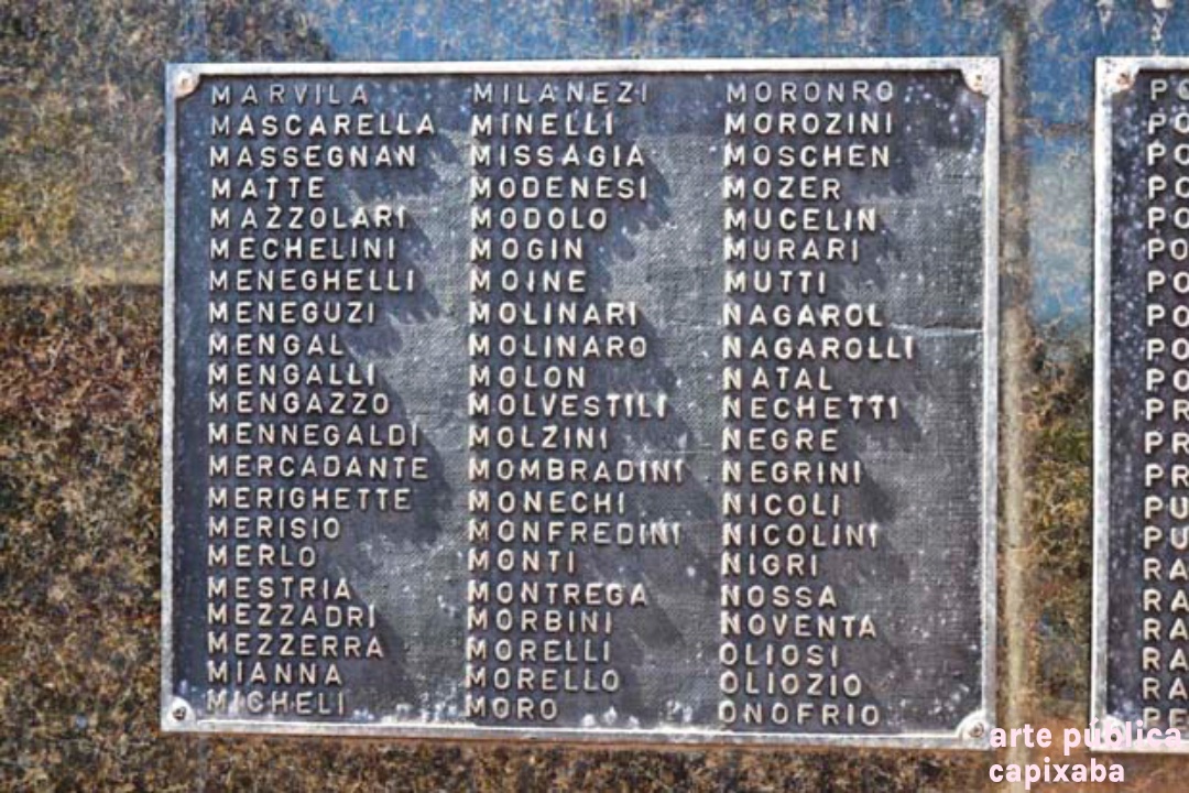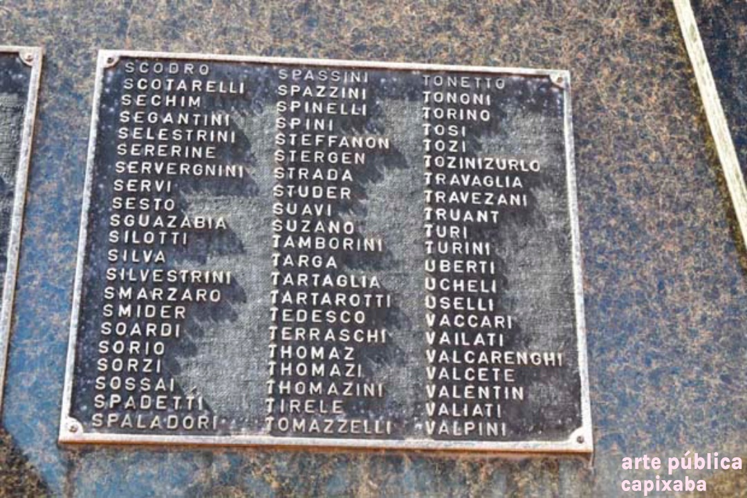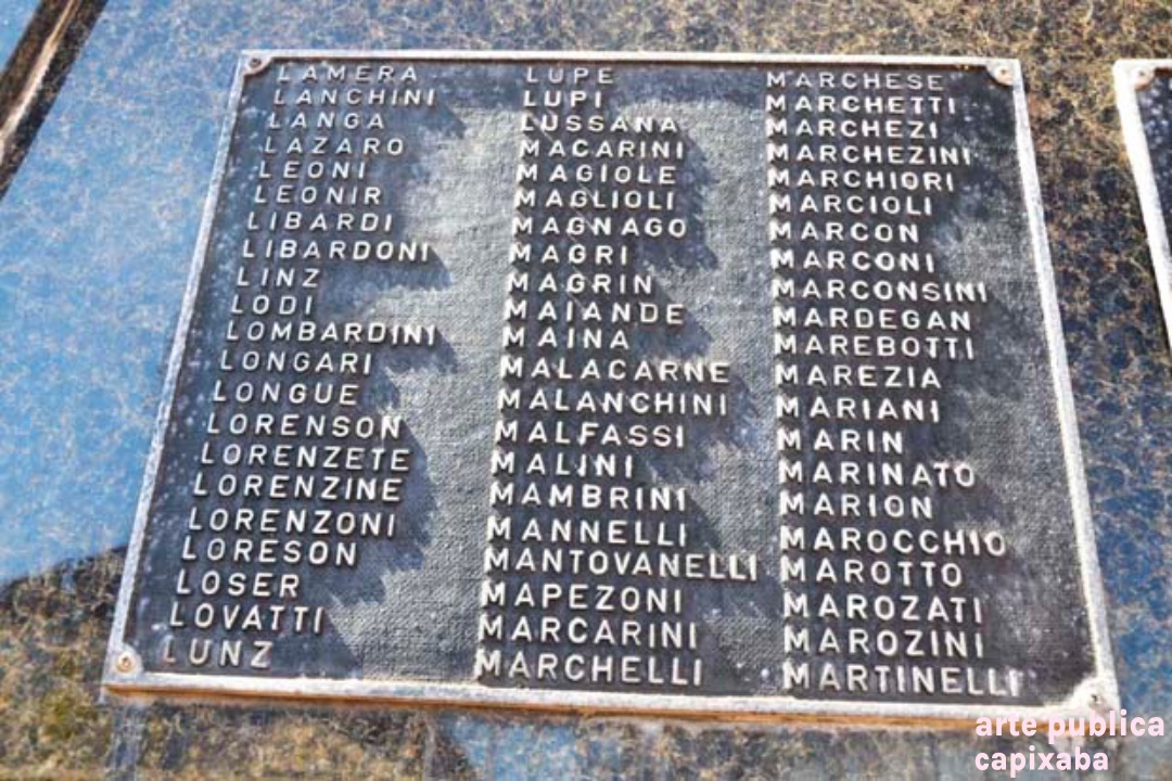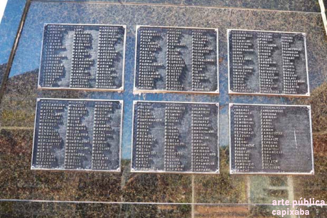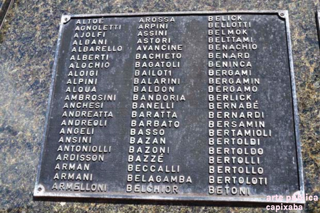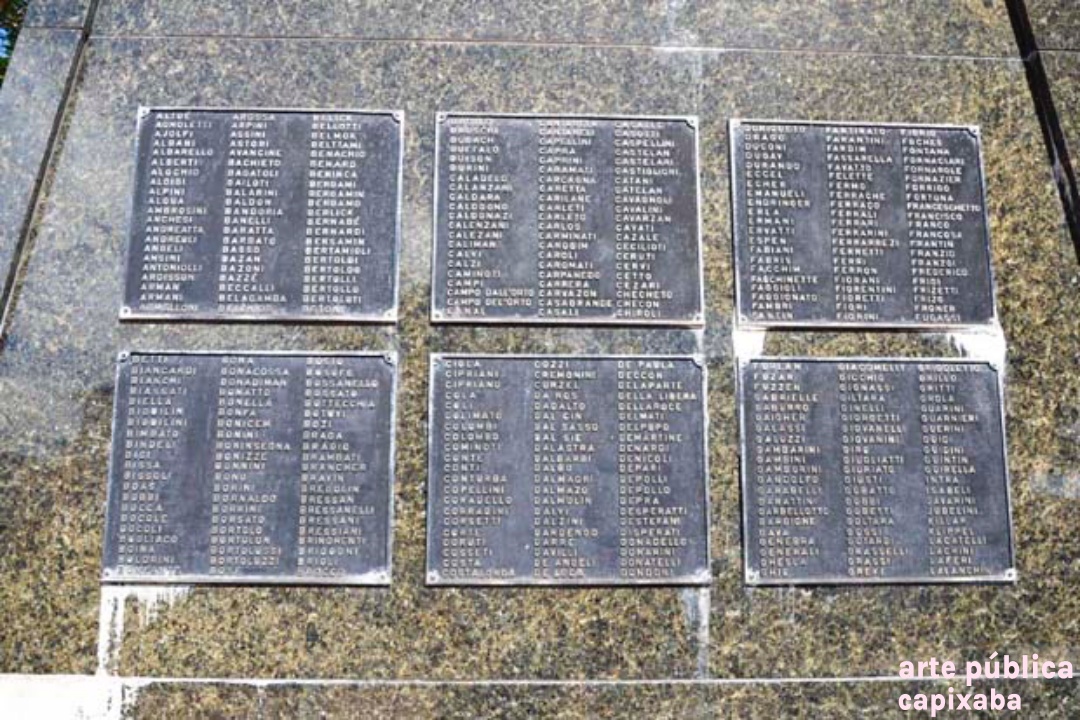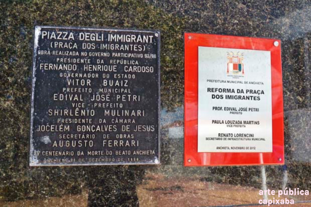 Lê-se: "PIAZZA DEGLI IMMIGRANT (PRACA DOS IMIGRANTES) OBRA REALIZADA NO GOVERNO PARTICIPATIVO 93/96 PRESIDENTE DA REPUBLICA FERNANDO HENRIQUE CARDOSO GOVERNADOR DO ESTADO VITOR BUAIZ PREFEITO MUNICIPAL EDIVAL JOSE PETRI VICEPREFEITO SHIRLÊNIO MULINARI PRESIDENTE DA CAMARA JOČELEM GONCALVES DE JESUS SECRETARIO DE OBRAS AUGUSTO FERRARI CENTENARIO DA MORTE DO BEATO ANCHIETA ANCHIETA, 21 DE DEZEMBRO DE ...."