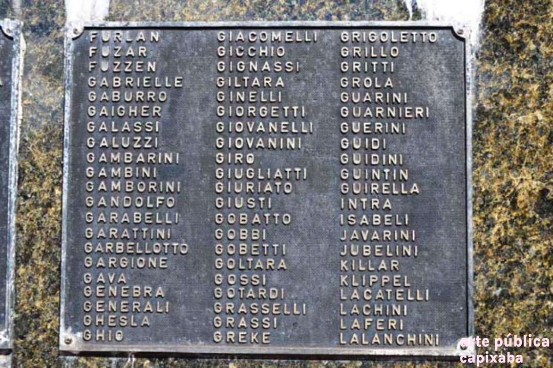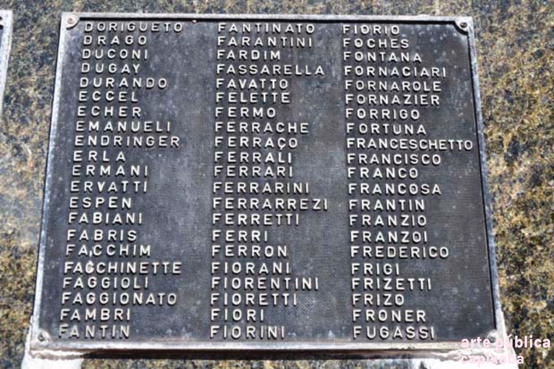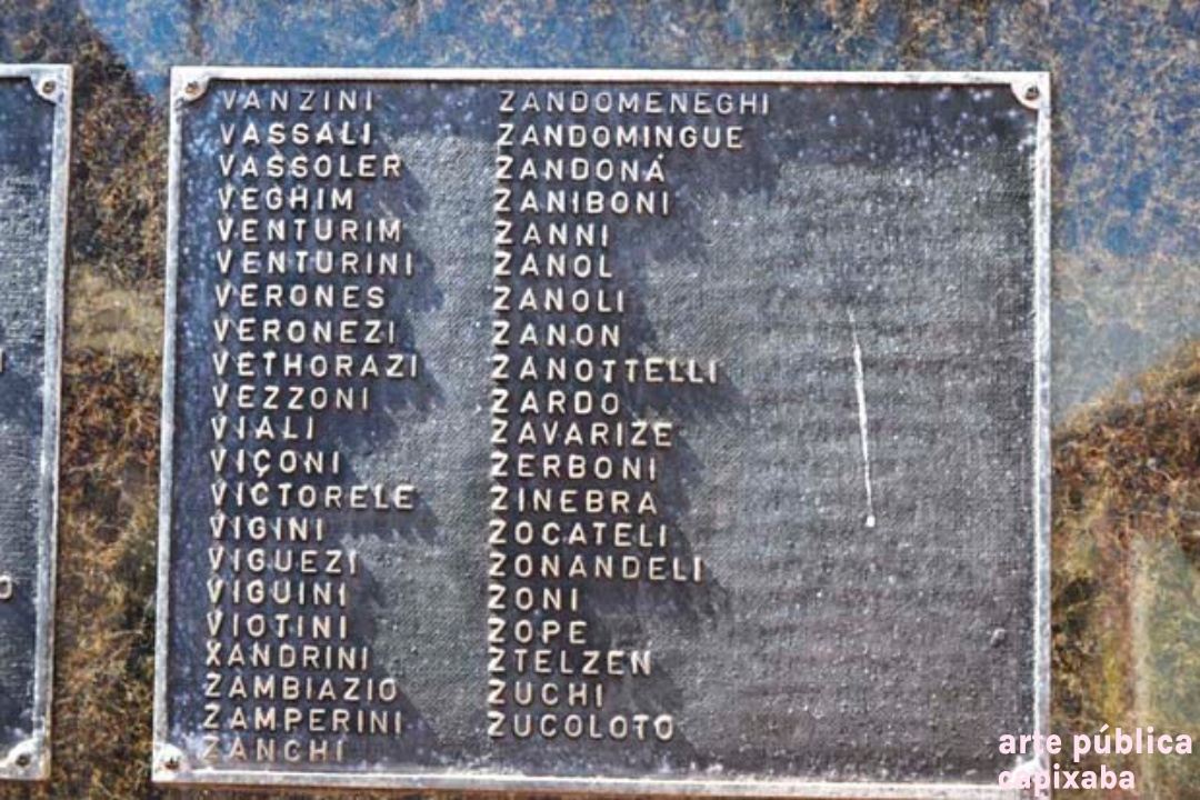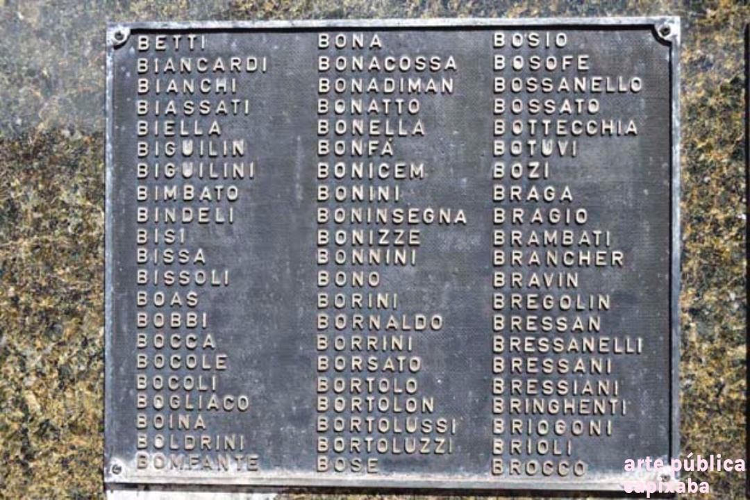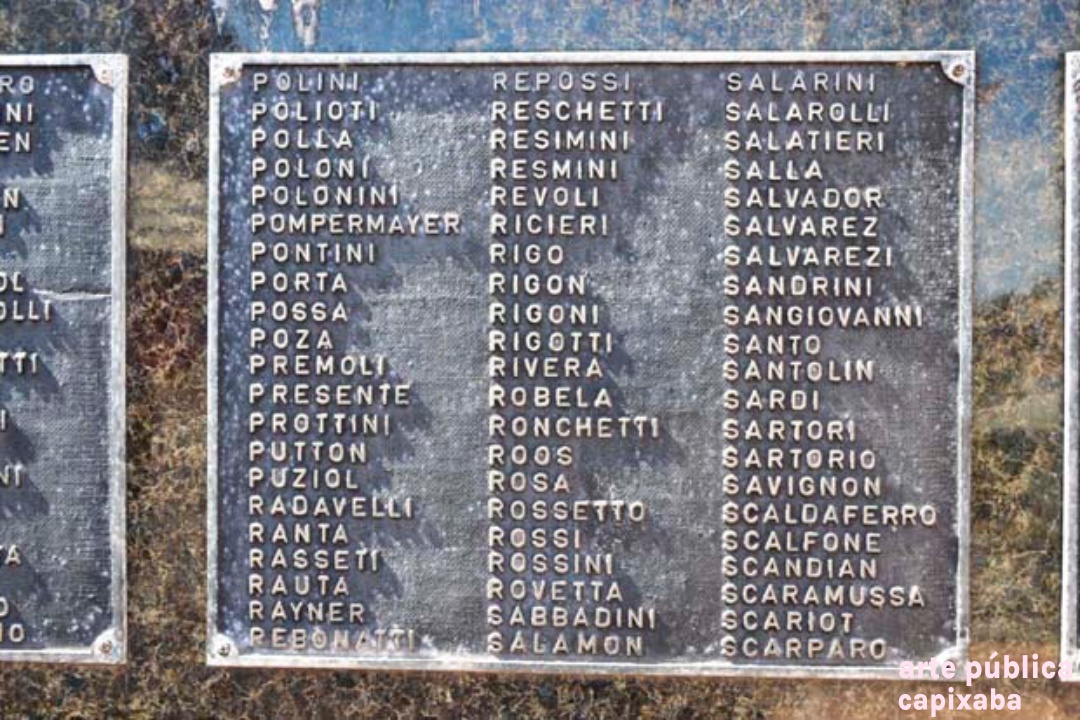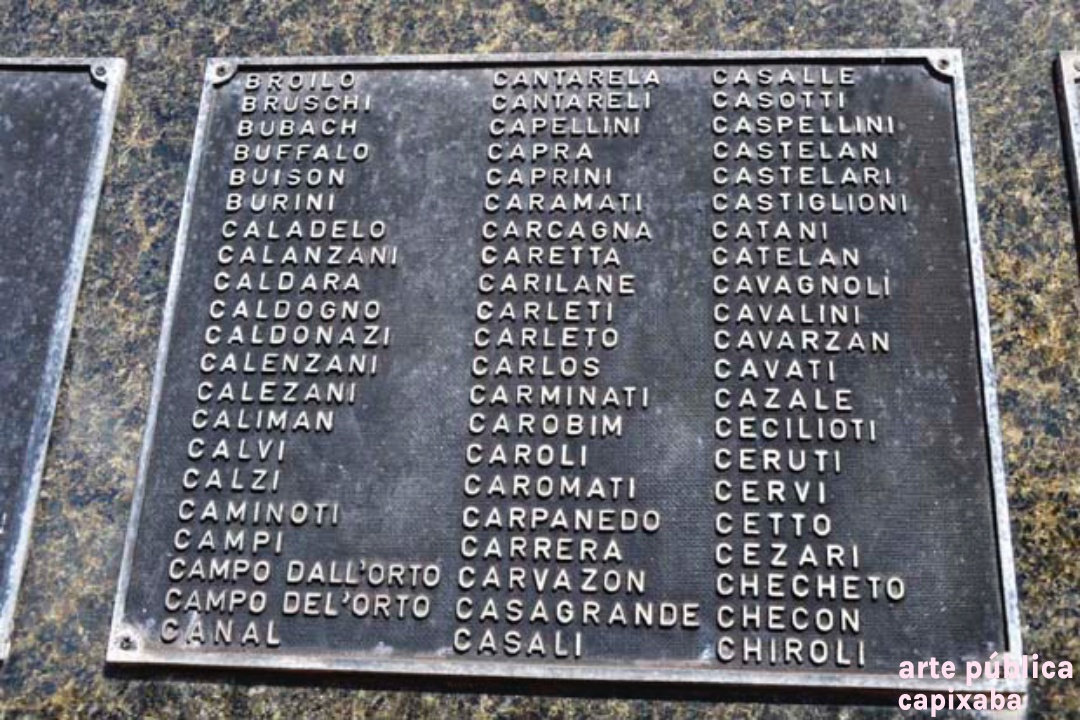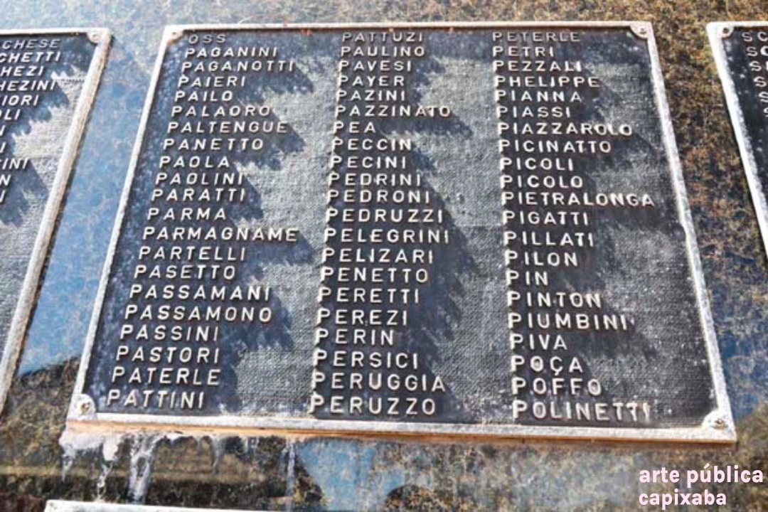 Lê-se: "PIAZZA DEGLI IMMIGRANT (PRACA DOS IMIGRANTES) OBRA REALIZADA NO GOVERNO PARTICIPATIVO 93/96 PRESIDENTE DA REPUBLICA FERNANDO HENRIQUE CARDOSO GOVERNADOR DO ESTADO VITOR BUAIZ PREFEITO MUNICIPAL EDIVAL JOSE PETRI VICEPREFEITO SHIRLÊNIO MULINARI PRESIDENTE DA CAMARA JOČELEM GONCALVES DE JESUS SECRETARIO DE OBRAS AUGUSTO FERRARI CENTENARIO DA MORTE DO BEATO ANCHIETA ANCHIETA, 21 DE DEZEMBRO DE ...."