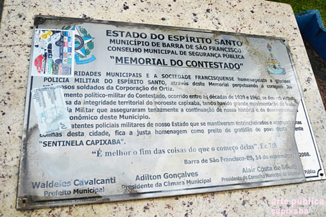 Lê-se: "Estado do Espírito Santo Município de Barra de São Francisco Conselho Municipal de Segurança Pública "Memorial do Contestado" Autoridades Municipais e a Sociedade Francisquense homenageiam a gloriosa Polícia Militar do Espírito Santo através deste Memorial, perpetuando a coragem...."