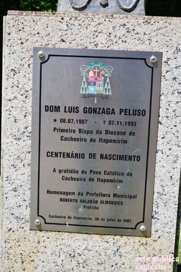 Lê-se: "Dom Luis Gonzaga Peluso /08.07.1907 – 07.11.1993/ Primeiro Bispo da Diocese de Cachoeiro de Itapemirim/ Homenagem da Prefeitura Municipal/ Homenagem da Prefeitura Municipal/ Roberto Valadão Almokdice/ Prefeito/ Cachoeiro de Itapemirim, 08 de julho de 2007."