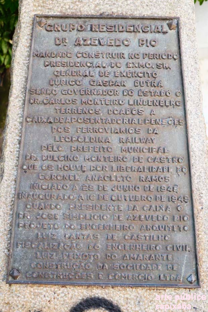 Lê-se: "Grupo residencial Dr Azevedo Pio mandado construir no período presidencial do Exmo. Sr. General do Exército Eurico Gaspar Dutra sendo Governador do Estado o Dr. Carlos Monteiro Lindemberg Terrenos doados à caixa de aposentadoria e pensões dos ferroviários da Leopoldina Railway pelo Prefeito Municipal Dr. Dulcino Monteiro de Castro que os houve por liberalidade do Coronel Anacleto Ramos Iniciado a 29 de junho de 1948 Inaugurado a 16 de outubro de 1949 quando Presidente da Caixa Dr. Jose Simplício de Azevedo Pio Projeto do engenheiro arquiteto Luiz Dantas de Castilho Fiscalização do engenheiro civil Luiz Peixoto do Amarante Construção da Sociedade de Construções e Comércio Ltda"