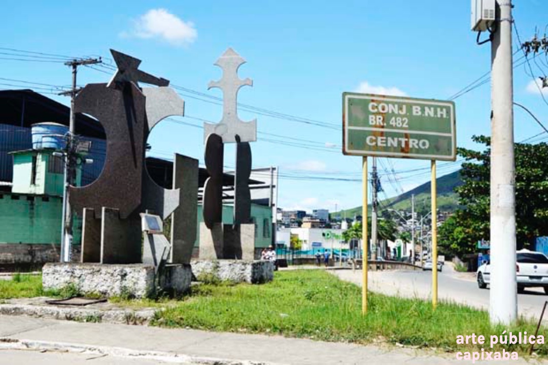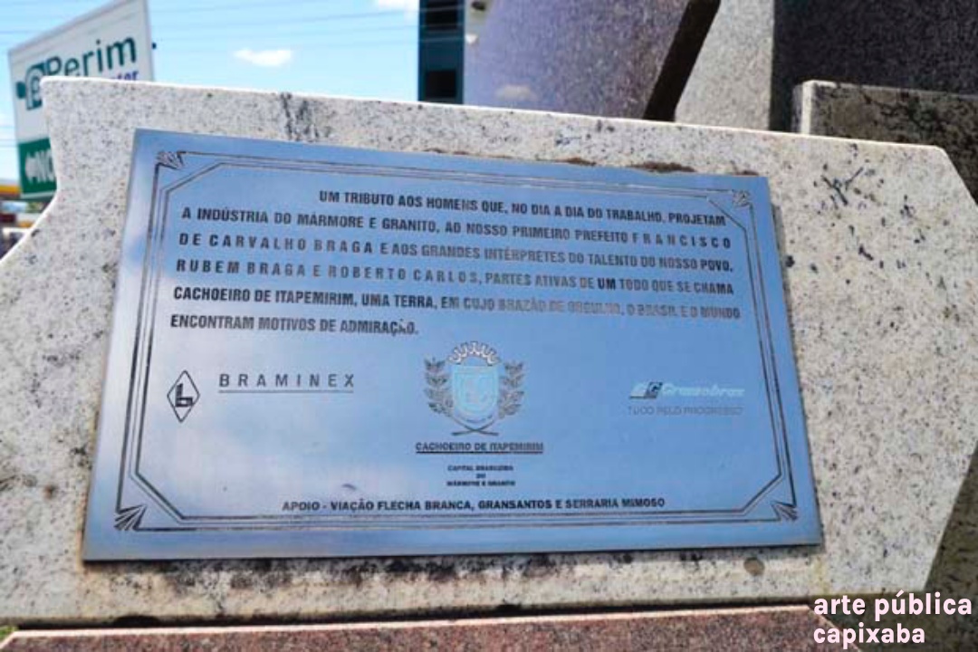 Lê-se: "Um tributo aos homens que, no dia do trabalho, projetam a indústria do mármore e granito. Ao nosso primeiro prefeito Francisco de Carvalho Braga e aos grandes intérpretes do talento do nosso povo. Rubem Braga e Roberto Carlos, partes ativas de um todo que se chama Cachoeiro de Itapemirim, uma terra em cujo brasão de orgulho, o Brasil e o mundo encontram motivo de admiração. Braminex Cachoeiro de Itapemirim Capital........ Apoio: Viação Flecha Branca, Gransantos e Serraria Mimoso"