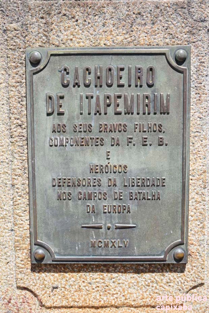 Lê-se: "Cachoeiro de Itapemirim Aos seus bravos filhos Componente da F.E.B e heroicos defensores da liberdade nos campos de batalha da Europa MCMXLV"