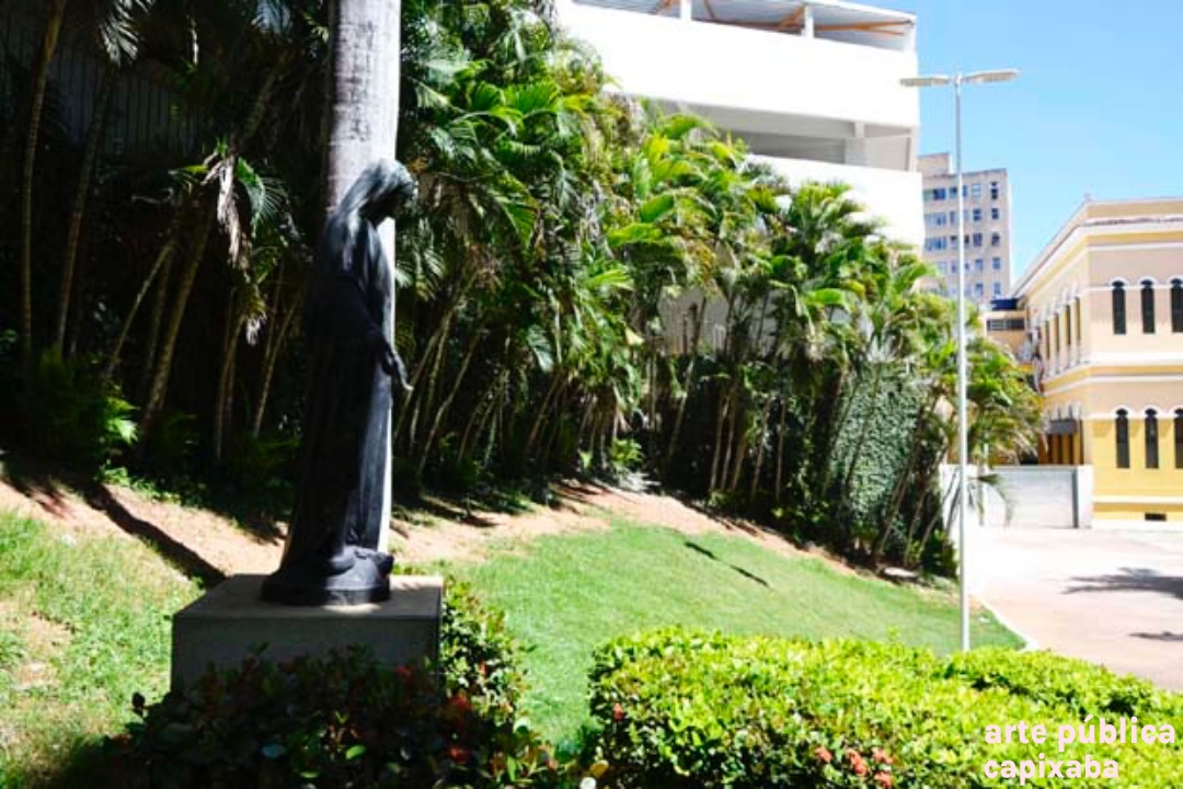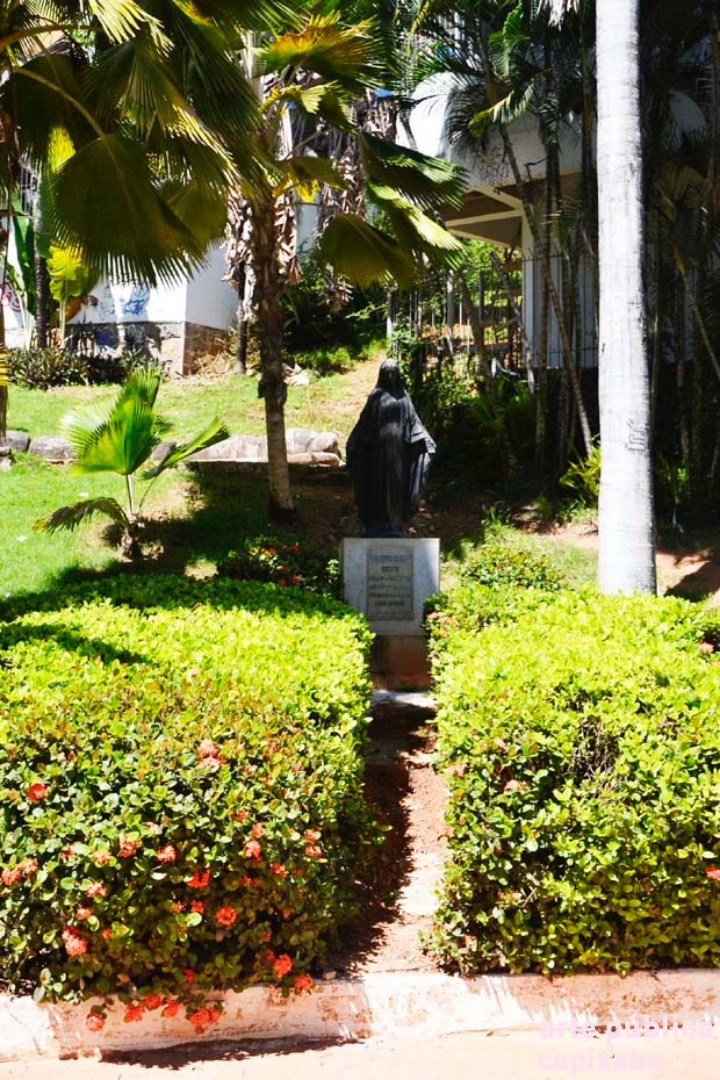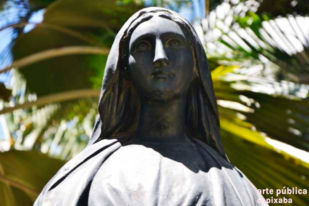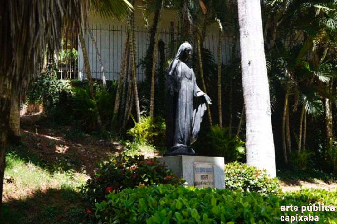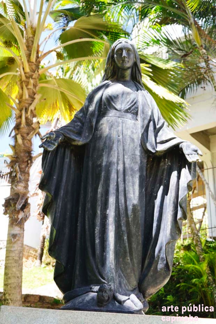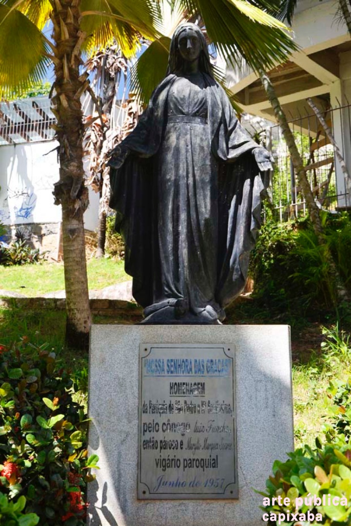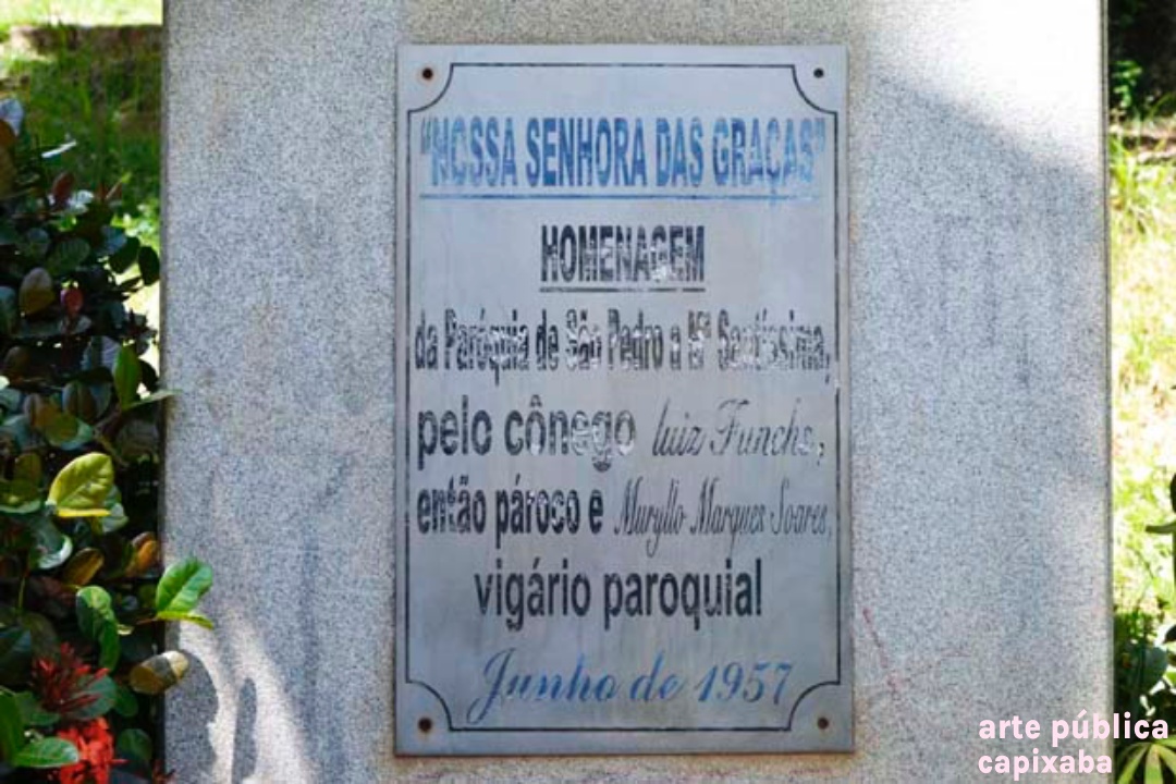 Lê-se: "NOSSA SENHORA DAS GRAÇAS HOMENAGEM Da Paróquia de São Pedro à Mª Santíssima, pelo cônego Luiz Funcho, então pároco e Muryllo Marques Soares vigário paroquial Junho de 1957."