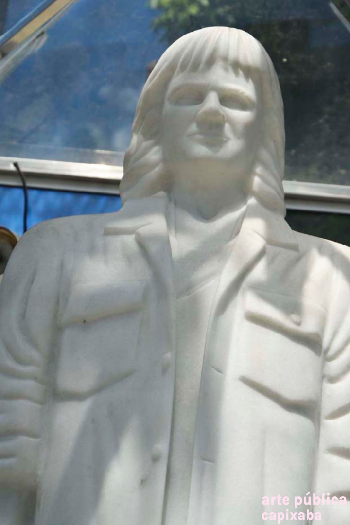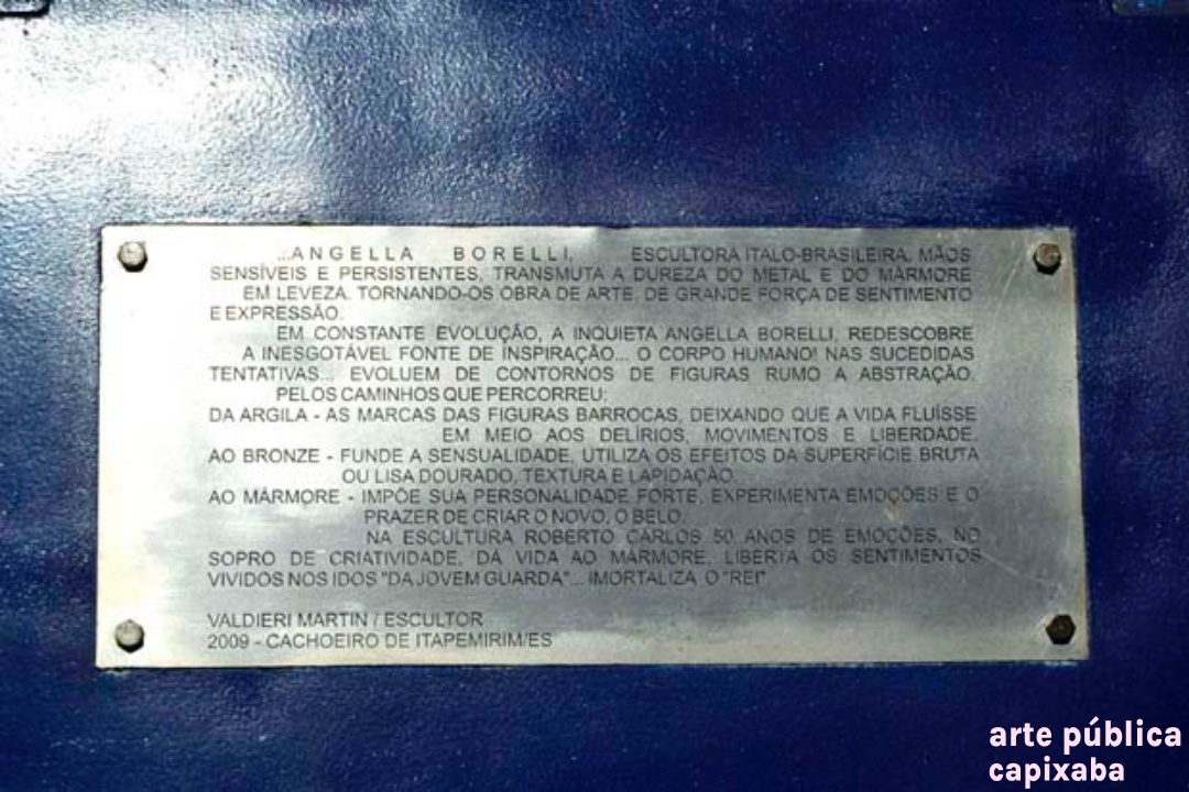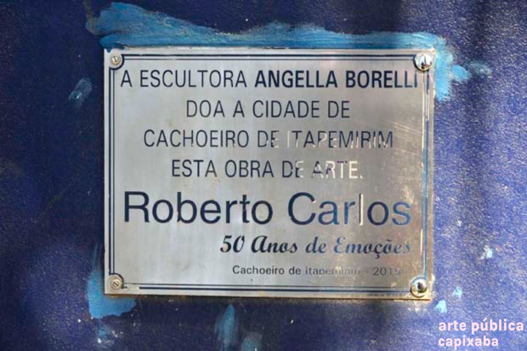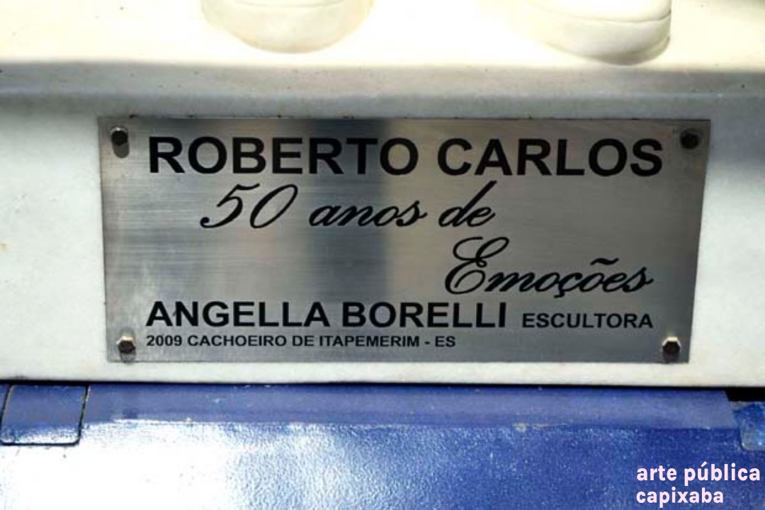 Lê-se: Placa 1: "Apoio/ Prefeitura Municipal de Cachoeiro de Itapemirim/ Prefeito: Carlos Roberto Casteglione Dias" Placa 2: "A escultora Angella Borelli/ doa a cidade de Cachoeiro de Itapemirim/ esta obra de arte./ Roberto Carlos/ 50 Anos de Emoções/ Cachoeiro de Itapemirim-2015" Placa 3: "ANGELA BORELLI, ESCULTORA ITALO-BRASILEIRA, MÃOS SENSÍVEIS E PERSISTENTES. TRANSMUTA A DUREZA DO METAL E DO MÁRMORE EM LEVEZA, TORNANDO-SE OBRA DE ARTE, DE GRANDE FORÇA DE SENTIMENTO E EXPRESSÃO. EM CONSTANTE EVOLUÇÃO, A INQUIETA ANGELLA BORELLI, REDESCOBRE A INESGOTÁVEL FONTE DE INSPIRAÇÃO... O CORPO HUMANO! NAS SUCEDIDAS TENTATIVAS... EVOLUEM DE CONTORNOS DE FIGURAS RUMO A ABSTRAÇÃO. PELOS CAMINHOS QUE PERCORREU; DA ARGILA- AS MARCAS DAS FIGURAS BARROCAS, DEIXANDO QUE A VIDA FLUÍSSE EM MEIO AOS DELÍRIOS, MOVIMENTOS E LIBERDADE. AO BRONZE- FUNDE A SENSUALIDADE, UTILIZA OS EFEITOS DA SUPERFÍCIE BRUTA OU LISA DOURADO, TEXTURA E LAPIDAÇÃO . AO MÁRMORE- IMPÕE SUA PERSONALIDADE FORTE, EXPERIMENTA EMOÇÕES E O PRAZER DE CRIAR O NOVO, O BELO. NA ESCULTURA ROBERTO CARLOS 50 ANOS DE EMOÇÕES, NO SOPRO DE CRIATIVIDADE DÁ VIDA AO MÁRMORE, LIBERTA OS SENTIMENTOS VIVIDOS NOS IDOS “DA JOVEM GUARDA”... IMORTALIZA O “REI”. VALDIERI MARTIN / ESCULTOR 2009 – CACHOEIRO DE IRAPEMIRIM/ES" Placa 4: "Roberto Carlos/ 50 anos de Emoções/Angella Borelli escultora/ 2009 Cachoeiro de Itapemirim – ES"