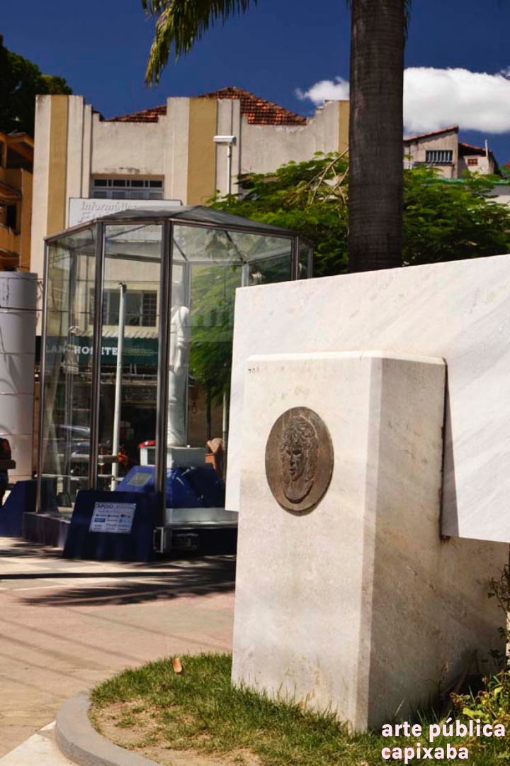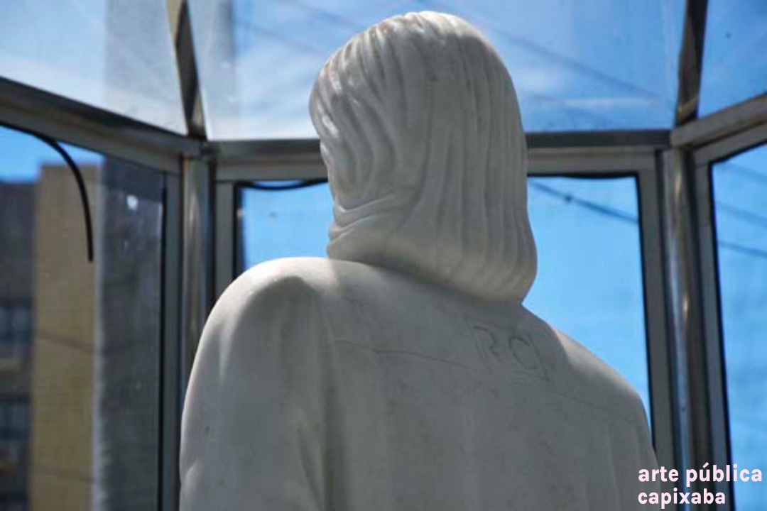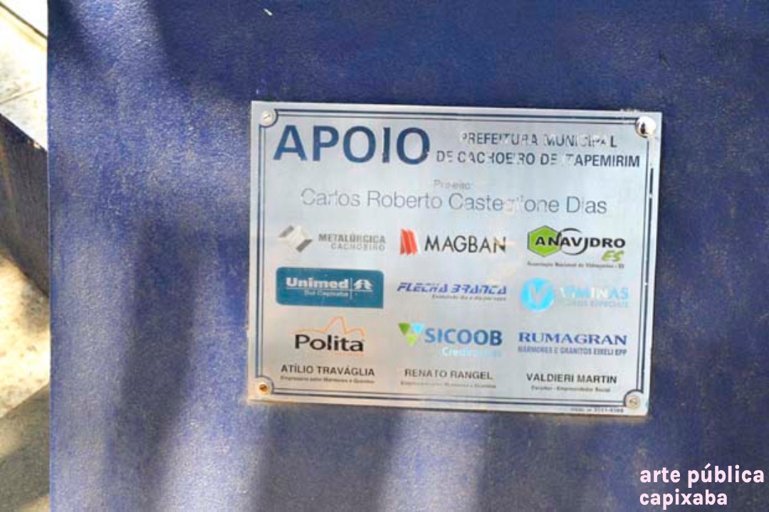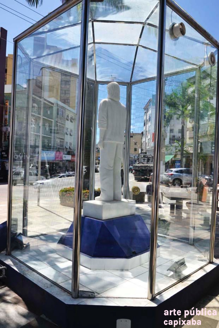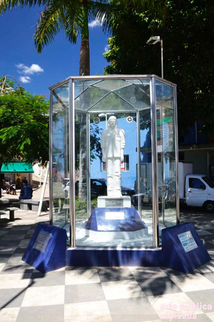 Lê-se: Placa 1: "Apoio/ Prefeitura Municipal de Cachoeiro de Itapemirim/ Prefeito: Carlos Roberto Casteglione Dias" Placa 2: "A escultora Angella Borelli/ doa a cidade de Cachoeiro de Itapemirim/ esta obra de arte./ Roberto Carlos/ 50 Anos de Emoções/ Cachoeiro de Itapemirim-2015" Placa 3: "ANGELA BORELLI, ESCULTORA ITALO-BRASILEIRA, MÃOS SENSÍVEIS E PERSISTENTES. TRANSMUTA A DUREZA DO METAL E DO MÁRMORE EM LEVEZA, TORNANDO-SE OBRA DE ARTE, DE GRANDE FORÇA DE SENTIMENTO E EXPRESSÃO. EM CONSTANTE EVOLUÇÃO, A INQUIETA ANGELLA BORELLI, REDESCOBRE A INESGOTÁVEL FONTE DE INSPIRAÇÃO... O CORPO HUMANO! NAS SUCEDIDAS TENTATIVAS... EVOLUEM DE CONTORNOS DE FIGURAS RUMO A ABSTRAÇÃO. PELOS CAMINHOS QUE PERCORREU; DA ARGILA- AS MARCAS DAS FIGURAS BARROCAS, DEIXANDO QUE A VIDA FLUÍSSE EM MEIO AOS DELÍRIOS, MOVIMENTOS E LIBERDADE. AO BRONZE- FUNDE A SENSUALIDADE, UTILIZA OS EFEITOS DA SUPERFÍCIE BRUTA OU LISA DOURADO, TEXTURA E LAPIDAÇÃO . AO MÁRMORE- IMPÕE SUA PERSONALIDADE FORTE, EXPERIMENTA EMOÇÕES E O PRAZER DE CRIAR O NOVO, O BELO. NA ESCULTURA ROBERTO CARLOS 50 ANOS DE EMOÇÕES, NO SOPRO DE CRIATIVIDADE DÁ VIDA AO MÁRMORE, LIBERTA OS SENTIMENTOS VIVIDOS NOS IDOS “DA JOVEM GUARDA”... IMORTALIZA O “REI”. VALDIERI MARTIN / ESCULTOR 2009 – CACHOEIRO DE IRAPEMIRIM/ES" Placa 4: "Roberto Carlos/ 50 anos de Emoções/Angella Borelli escultora/ 2009 Cachoeiro de Itapemirim – ES"