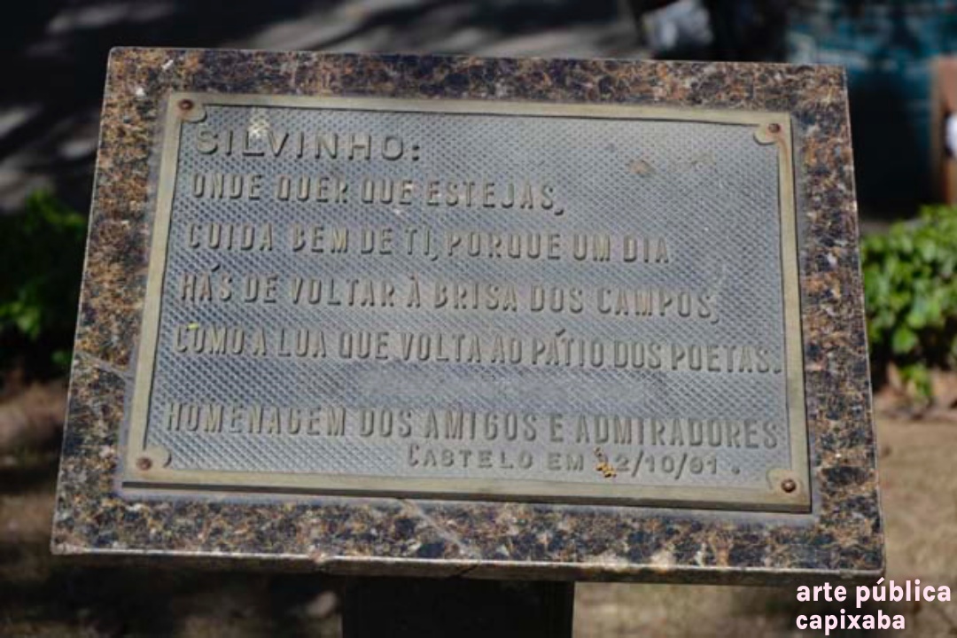 Lê-se: "Silvinho: Onde quer que estejas, cuida bem de ti, porque um dia hás de voltar à brisa dos campos, como a lua que volta ao pátio dos poetas. Homenagem dos amigos e admiradores Castelo, em 12/10/91"