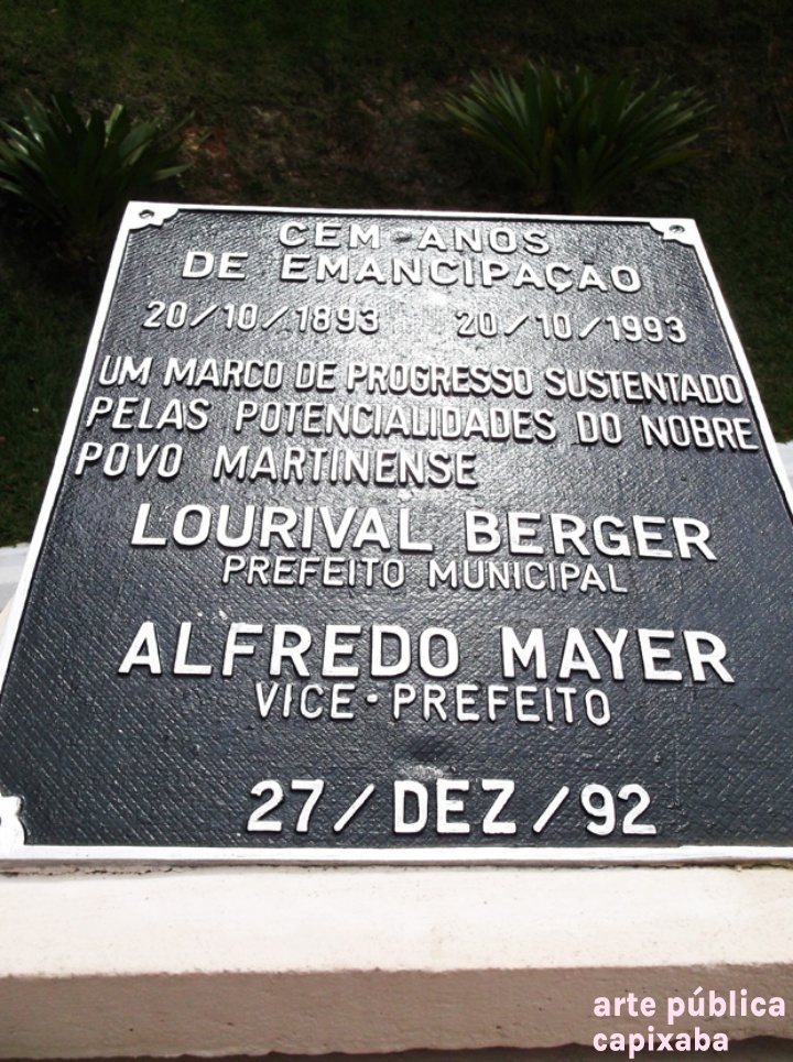 Lê-se: "CEM ANOS DE EMANCIPACAO 20/10/1893 - 20/10/1993 UM MARCO DE PROGRESSO SUSTENTADO PELAS POTENCIALIDADES DO NOBRE POVO MARTINENSE LOURIVAL BERGER PREFEITO MUNICIPAL ALFREDO MAYER VICE PREFEITO 27/DEZ/92"