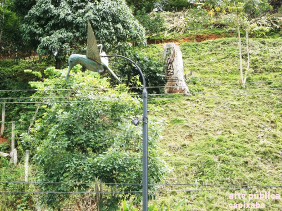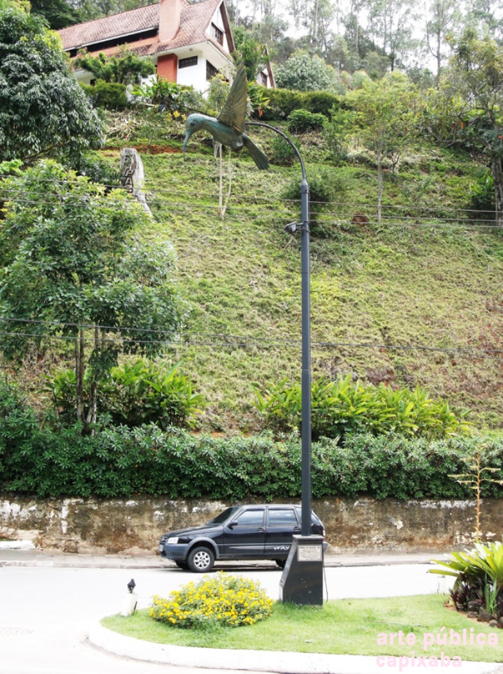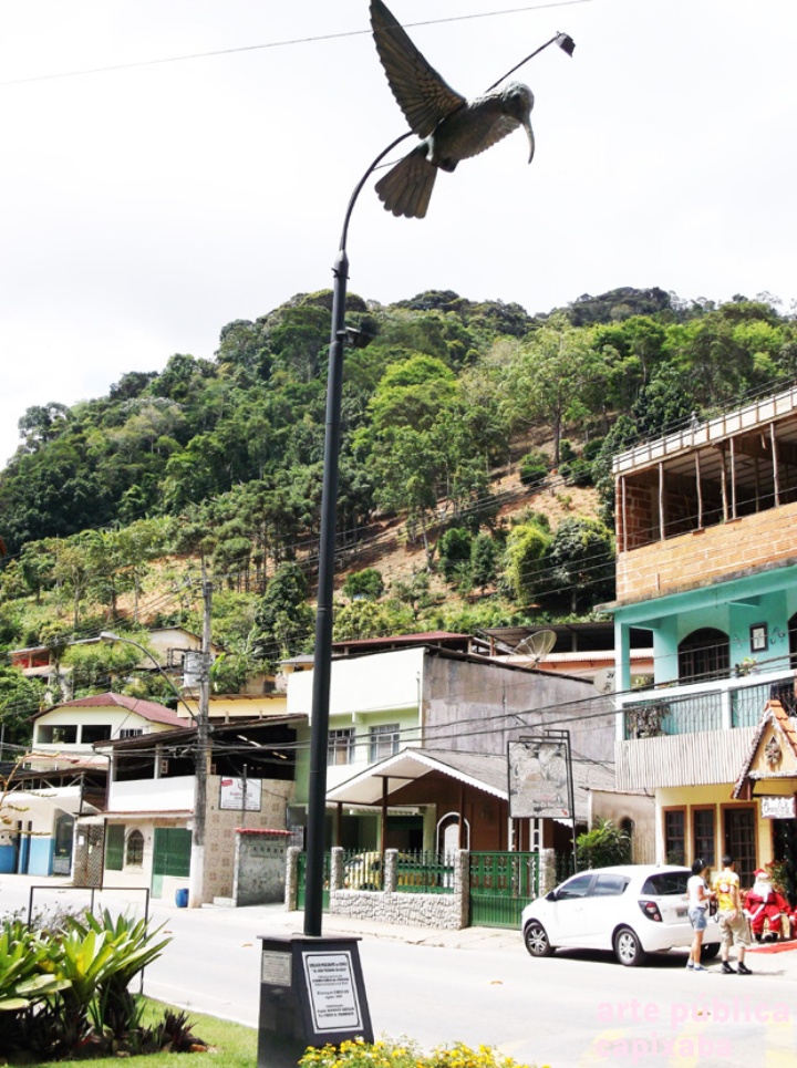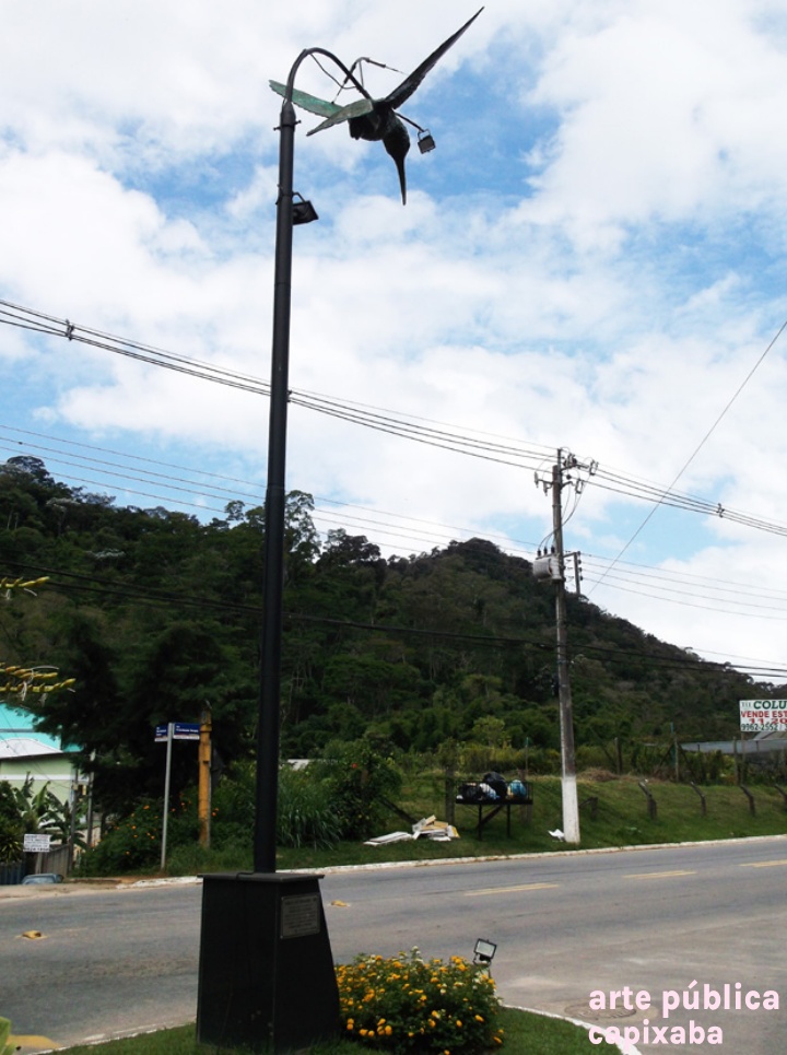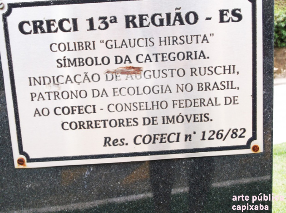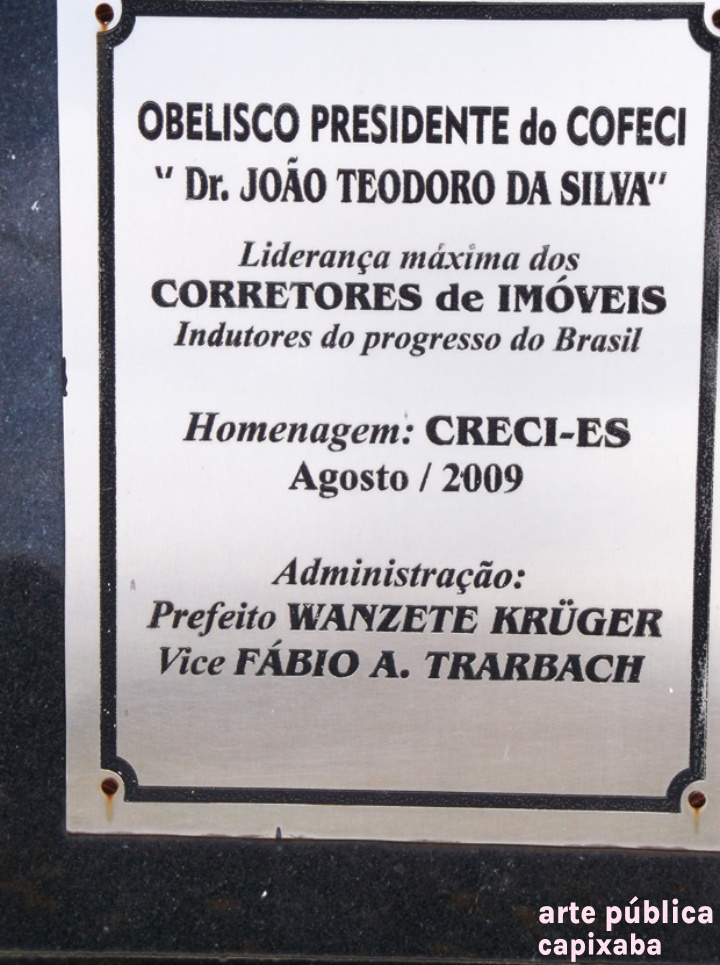 Lê-se: Placa 1: "OBELISCO PRESIDENTE do COFECI Dr. JOÃO TEODORO DA SILVA" Liderança máxima dos CORRETORES de IMÓVEIS Indutores do progresso do Brasil Homenagem: CRECI-ES Agosto/ 2009 Administração: Prefeito WANZETE KRÜGER Vice FÁBIO A. TRARBACH" Placa 2: "CRECI 13ª REGIÃO - ES COLIBRI "GLAUCIS HIRSUTA" SÍMBOLO DA CATEGORIA. INDICACÃO DE AGUSTO RUSCHI PATRONO DA ECOLOGIA NO BRASIL, AO COFECI CONSELHO FEDERAL DE CORRETORES DE IMÓVEIS. Res. COFECI n' 126/82"