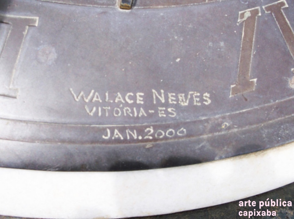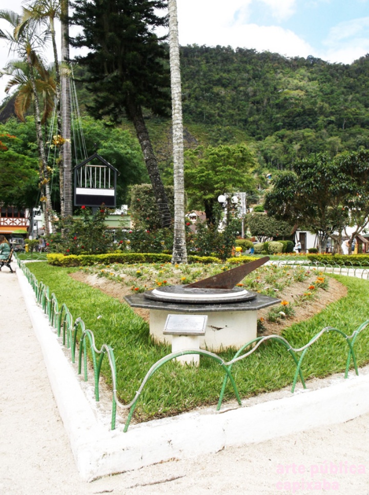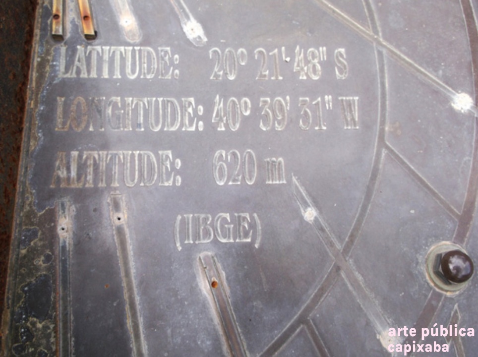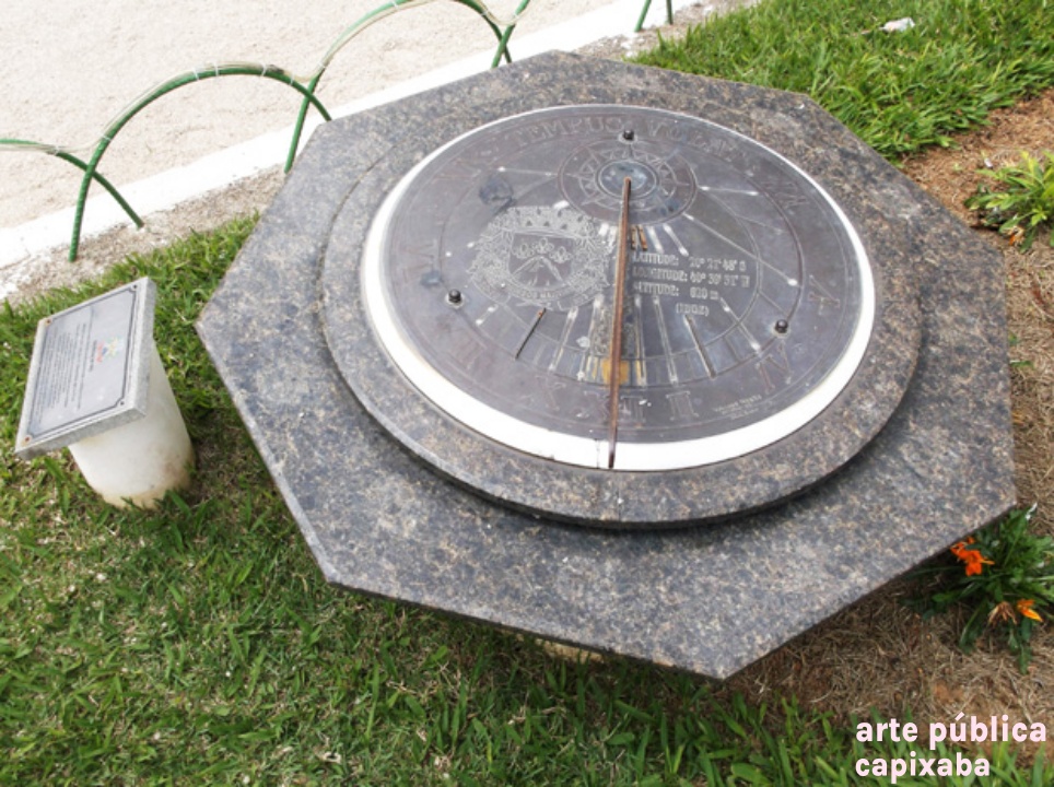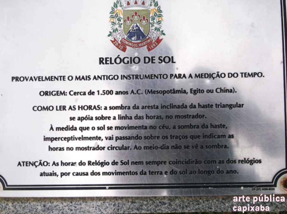 Lê-se: "RELÓGIO DE SOL PROVAVELMENTE O MAIS ANTIGO INSTRUMENTO PARA A MEDIÇÃO DO TEMPO. ORIGEM: Cerca de 1.500 anos A.C. (Mesopotâmia, Egito ou China). COMO LER AS HORAS: a sombra da aresta inclinada da haste triangular se apóia sobre a linha das horas, no mostrador. A medida que o sol se movimenta no céu, a sombra da haste, imperceptivelmente, vai passando sobre os traços que indicam as horas no mostrador circular. Ao meio-dia não se vê a sombra. ATENÇÃO: As horas do Relógio de Sol nem sempre coincidirão com as dos relógios atuais, por causa dos movimentos da terra e do sol ao longo do ano."