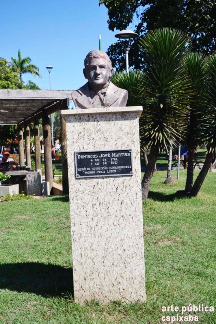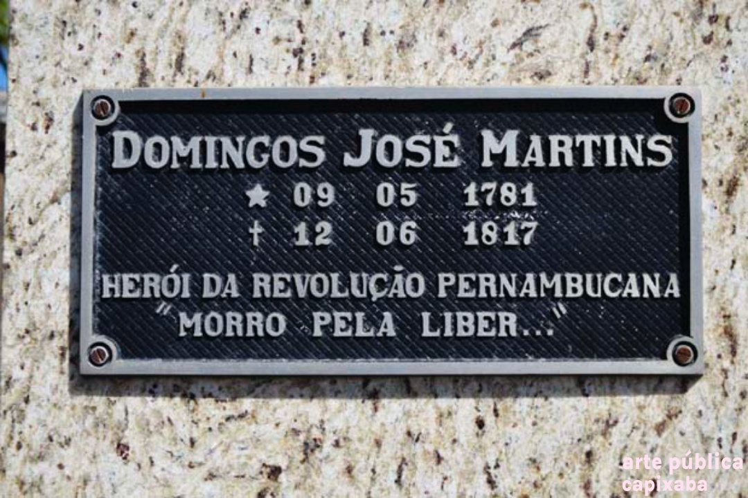 Sobre o homenageado: Domingos José Martins, nasceu no dia 9 de maio de 1781 na Fazenda Caxangá, em Itapemirim, onde hoje se localiza o município de Marataízes. Filho do militar Joaquim José Martins e de Joana Luiza de Santa Clara Martins, que tiveram mais sete filhos. Casou-se com Maria Teodora da Costa poucos dias antes de seu fuzilamento. O capitão comandava o “Quartel” de estrada, criado em 1810, em frente à Ilha das Andorinhas na localidade (praia) de Boa Vista do sul, ali localizado para fiscalizar e impedir o desembarque clandestino de africanos. O quartel também servia de apoio e proteção aos viajantes dos ataques dos índios Botocudos e Puris. Domingos José Martins liderou a chamada Revolução Pernambucana, também conhecida como Revolução dos Padres, que foi um movimento emancipacionista que eclodiu em 06 de março de 1817, na então Capitania de Pernambuco, no nordeste do Brasil. Dentre as suas causas, destacam-se a crise econômica regional, o absolutismo monárquico português e a influência das ideias Iluministas. Foi o único movimento separatista do período colonial que ultrapassou a fase conspiratória e atingiu o processo revolucionário de tomada do poder. A Revolução liderada por Domingos Martins foi o maior movimento autonomista de inspiração republicana do Brasil, ocupando um lugar de honra na história. Tanto que, para muitos historiadores, a Inconfidência Mineira, que não passou da fase da conspiração, perde em importância, abrangência e conteúdo para o referido movimento, que tinha como meta fazer da colônia brasileira um novo país, com ideais de liberdade, igualdade e fraternidade, preceitos éticos e valores morais para todos os seus cidadãos. Derrotado, foi preso e enviado à Bahia, sendo fuzilado em 12 de junho de 1817, no Campo da Pólvora, hoje conhecido como Campo dos Mártires.(1)