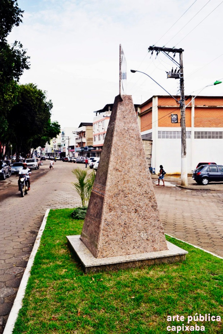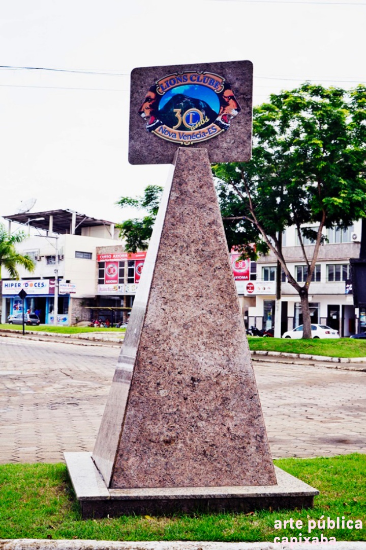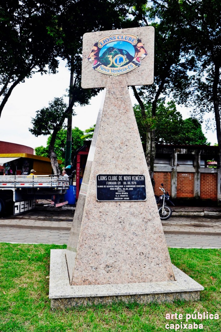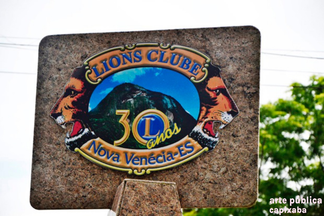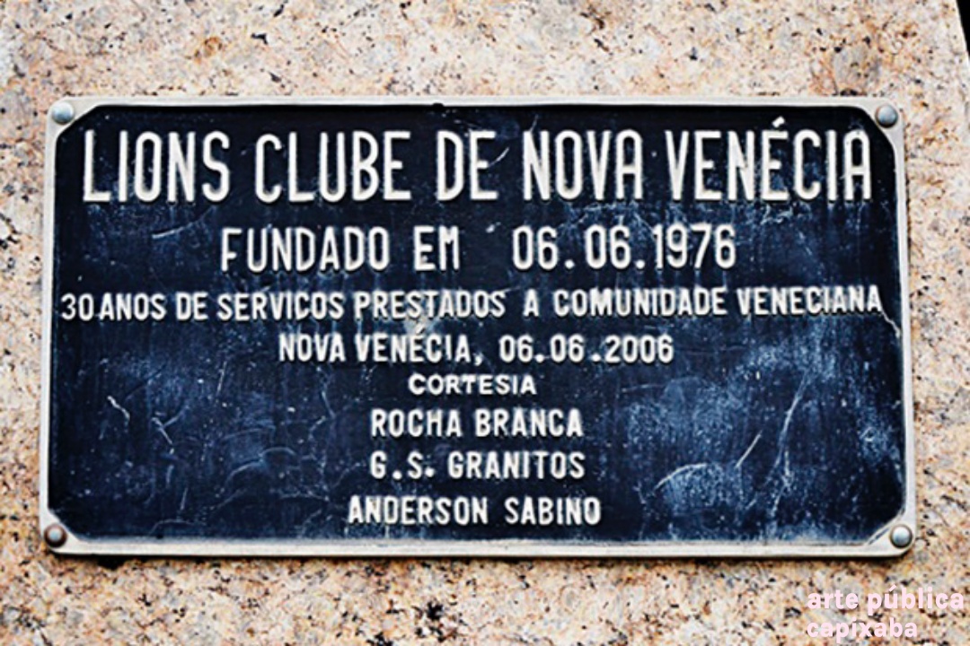 Lê-se: "Lions Clube de Nova Venécia fundado em 06.06.1976 30 anos de serviço prestados a comunidade veneciana Nova Venécia, 06.06.2006 Cortesia - Rocha Branca; G.S. Granitos; Anderson Sabino"