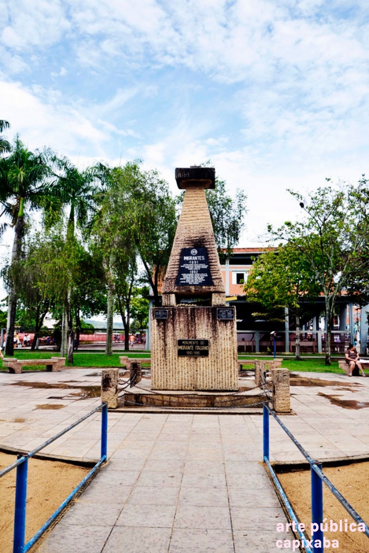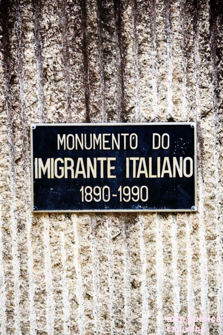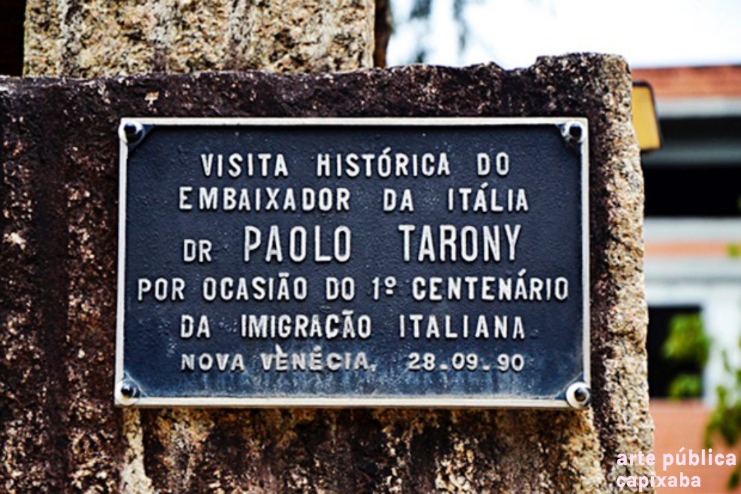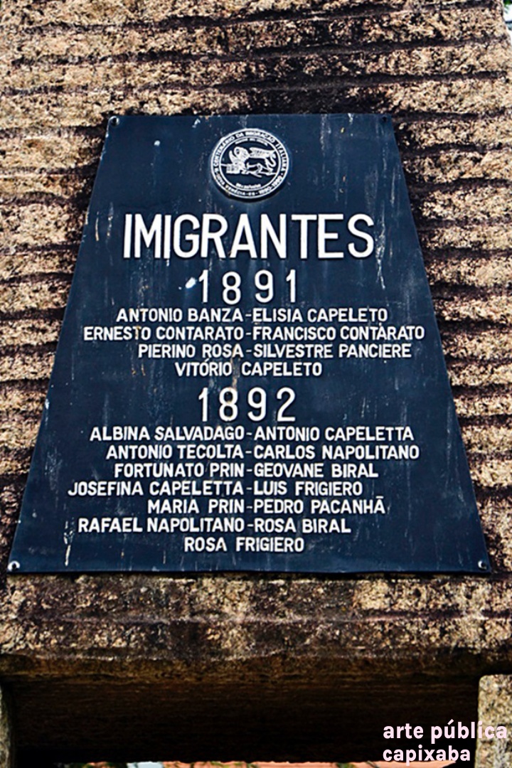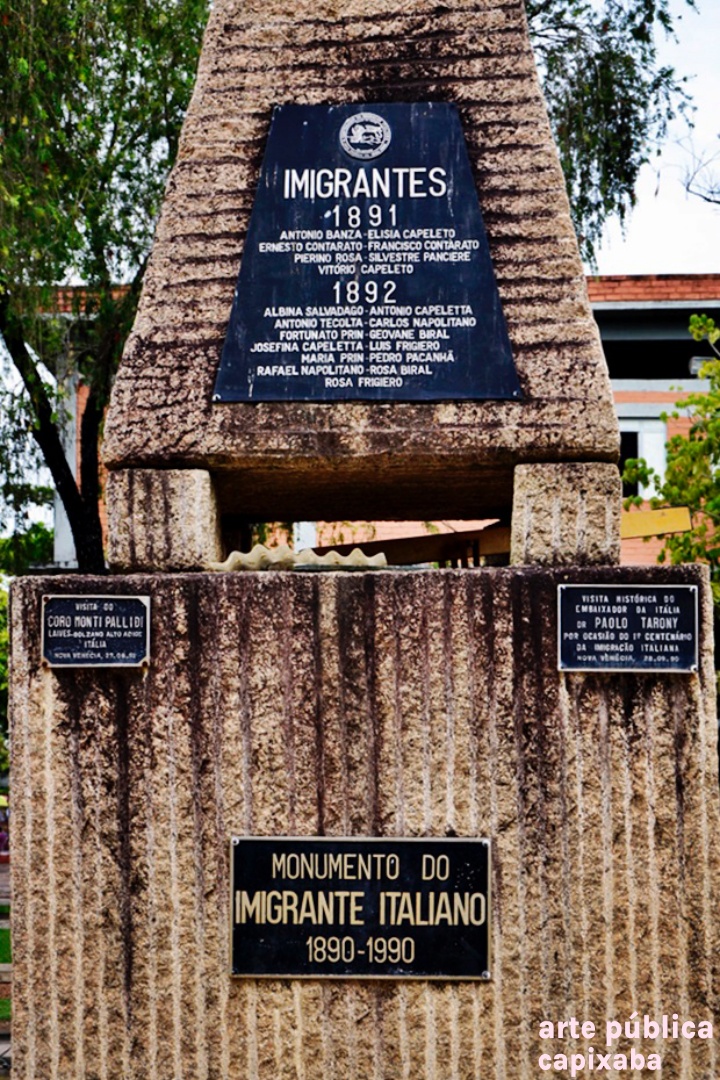 Lê-se: Placa 1: "Monumento do Imigrante Italiano 1890-1990" Placa 2: "Visita do Coro Monti Pallidi Laives-Bolzano Alto Adige Itália Nova Venécia, 27-08-91" Placa 3: "Visita histórica do embaixador da Itália Dr. Paolo tarony por ocasião do primeiro centenário da imigração italiana Nova Venécia, 28.09.90" Placa 4: Agradecimento Granasa granitos nacionais ltda a pioneira da extração do granito em Nova Venécia - Waldomiro Robson diretor presidente"