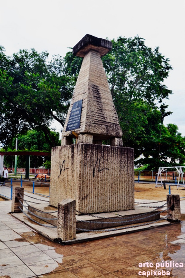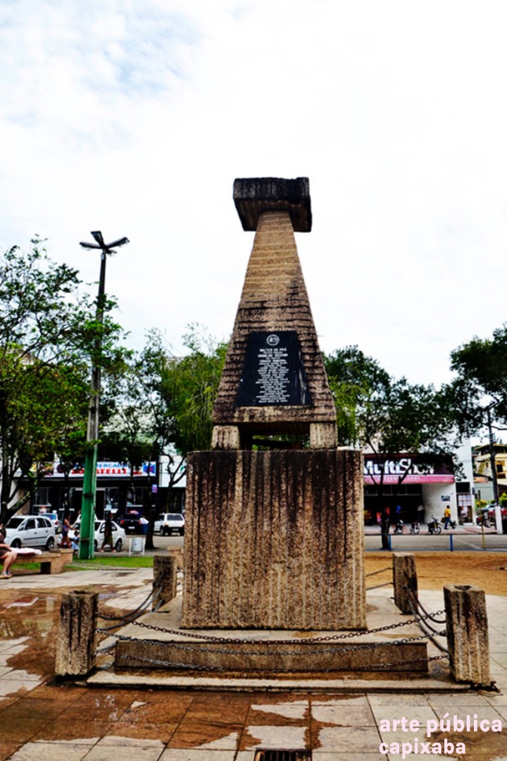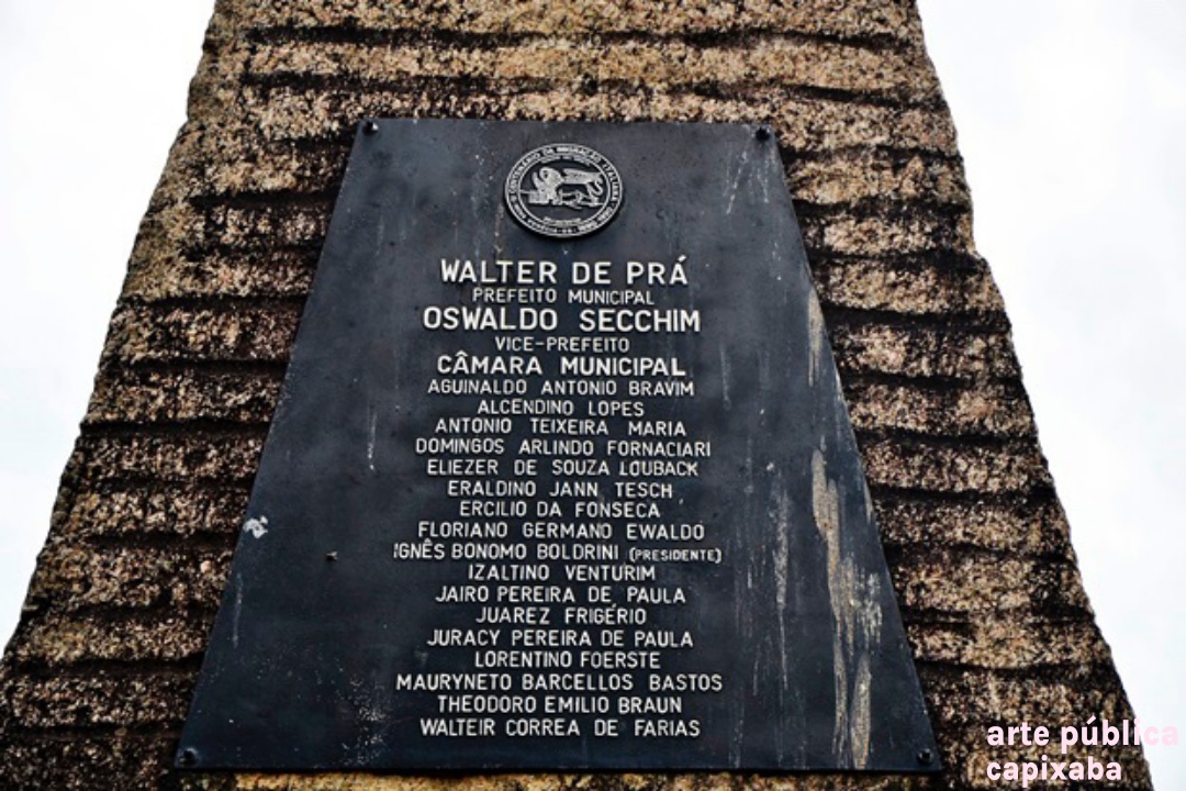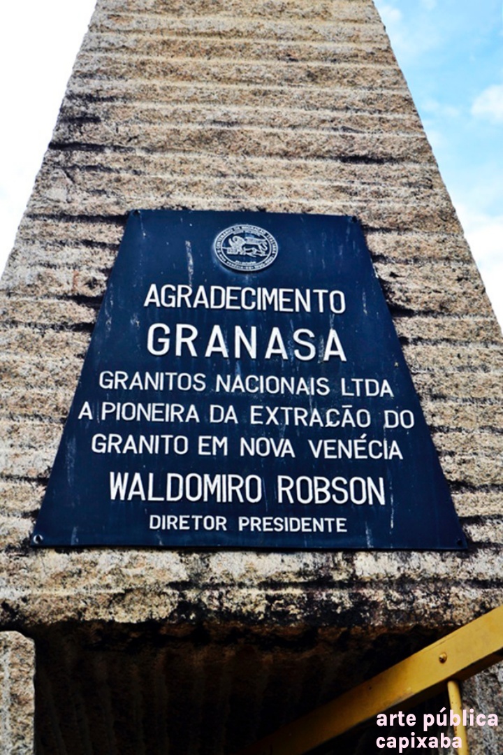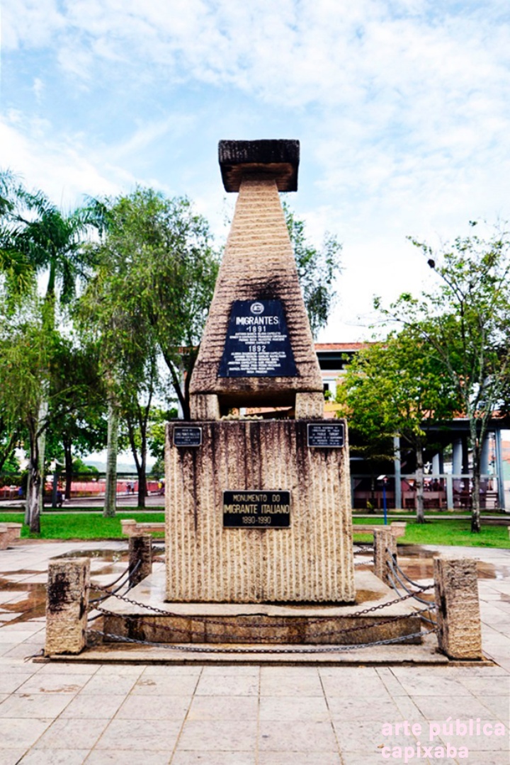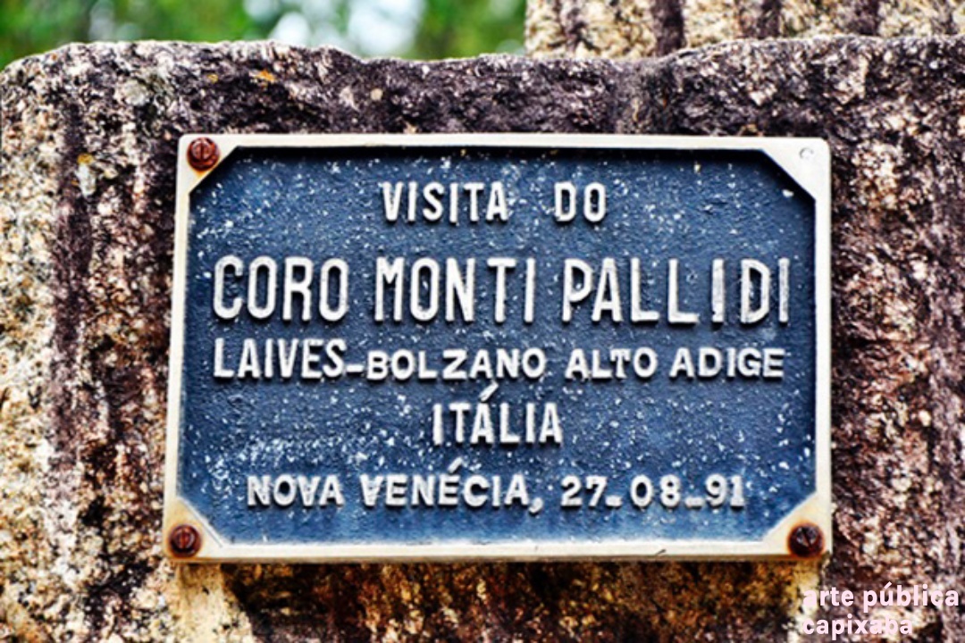 Lê-se: Placa 1: "Monumento do Imigrante Italiano 1890-1990" Placa 2: "Visita do Coro Monti Pallidi Laives-Bolzano Alto Adige Itália Nova Venécia, 27-08-91" Placa 3: "Visita histórica do embaixador da Itália Dr. Paolo tarony por ocasião do primeiro centenário da imigração italiana Nova Venécia, 28.09.90" Placa 4: Agradecimento Granasa granitos nacionais ltda a pioneira da extração do granito em Nova Venécia - Waldomiro Robson diretor presidente"