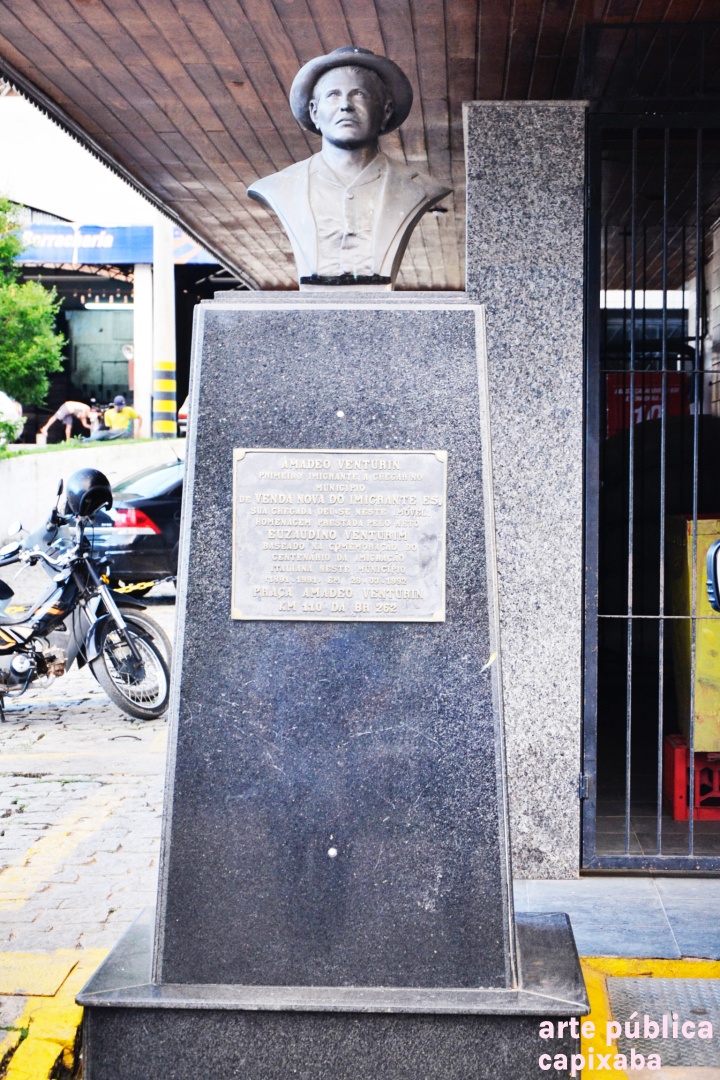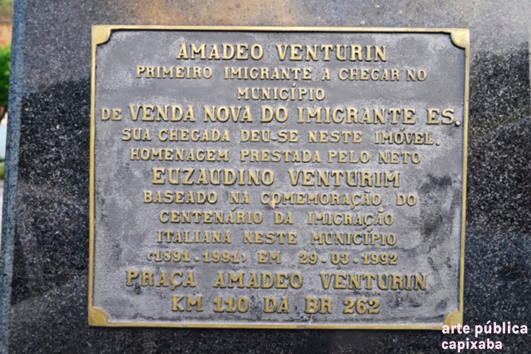 AMADEO VENTURIN PRIMEIRO IMIGRANTE A CHEGAR NO MUNICÍPIO DE VENDA NOVA DO IMIGRANTE ES. SUA CHEGADA DEU-SE NESTE IMÓVEL. HOMENAGEM PRESTADA PELO NETO EUZAUDINO VENTURIM BASEADO NA COMEMORAÇÃO DO CENTENÁRIO DA IMIGRAÇÃO ITALIANA NESTE MUNICÍPIO (1891 - 1991) EM 29 - 03 - 1992 PRAÇA AMADEO VENTURIN KM 110 DA BR 262