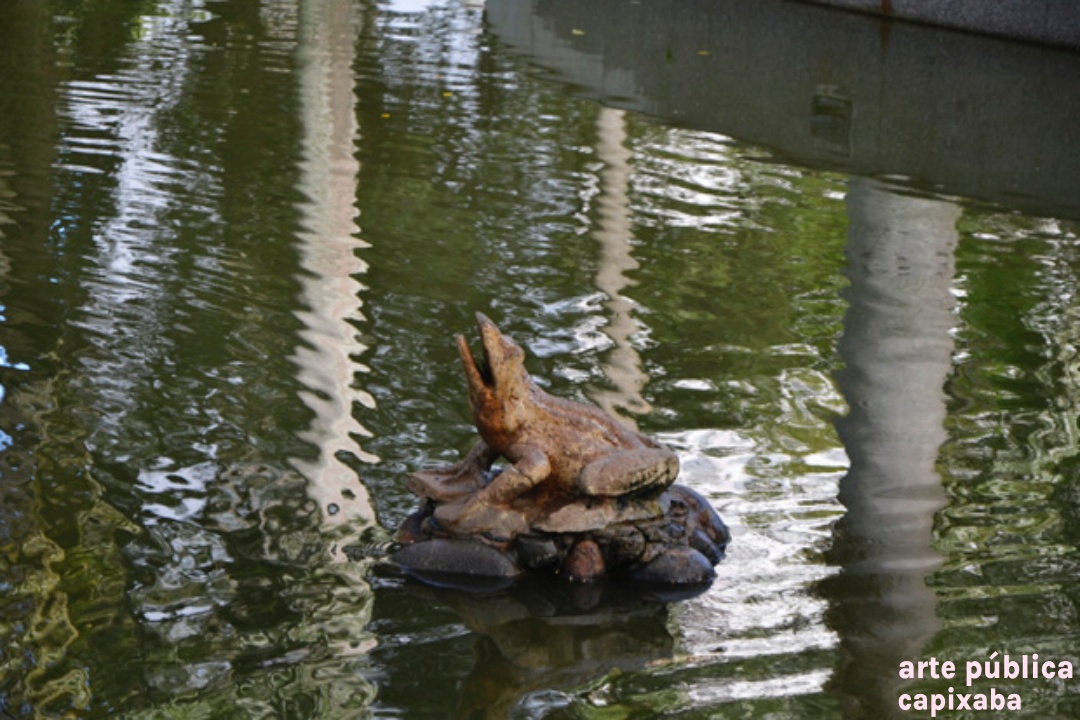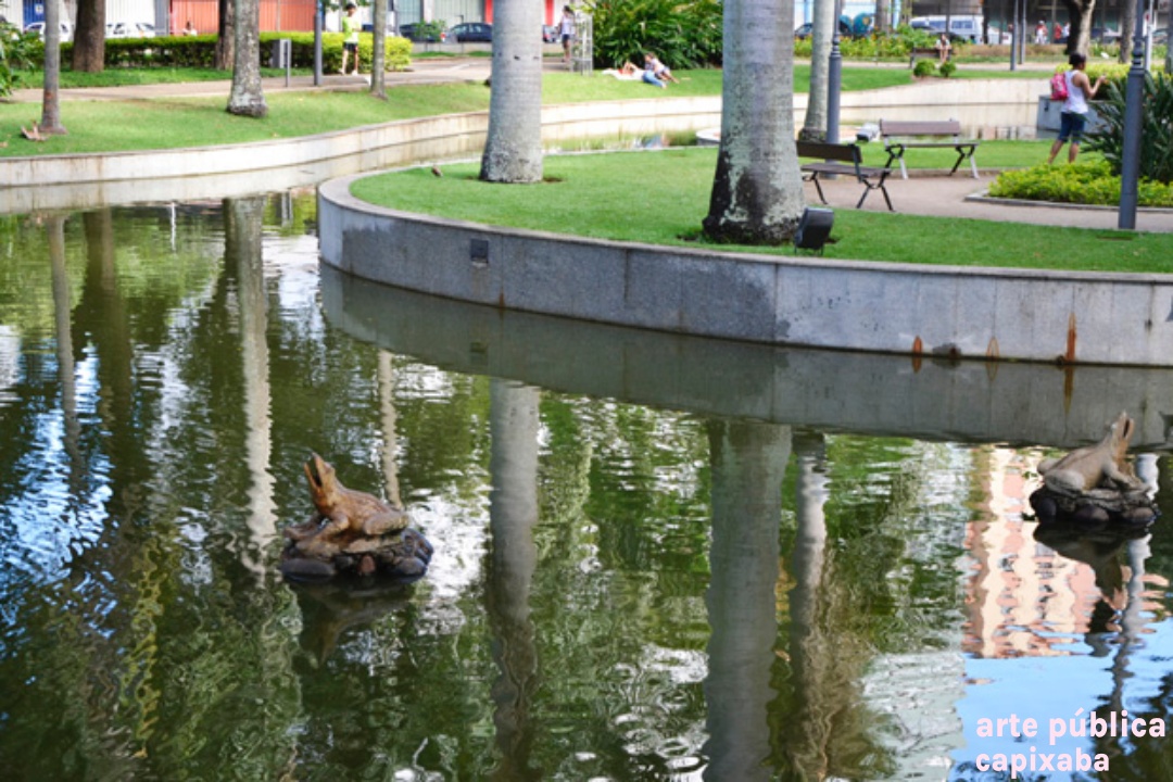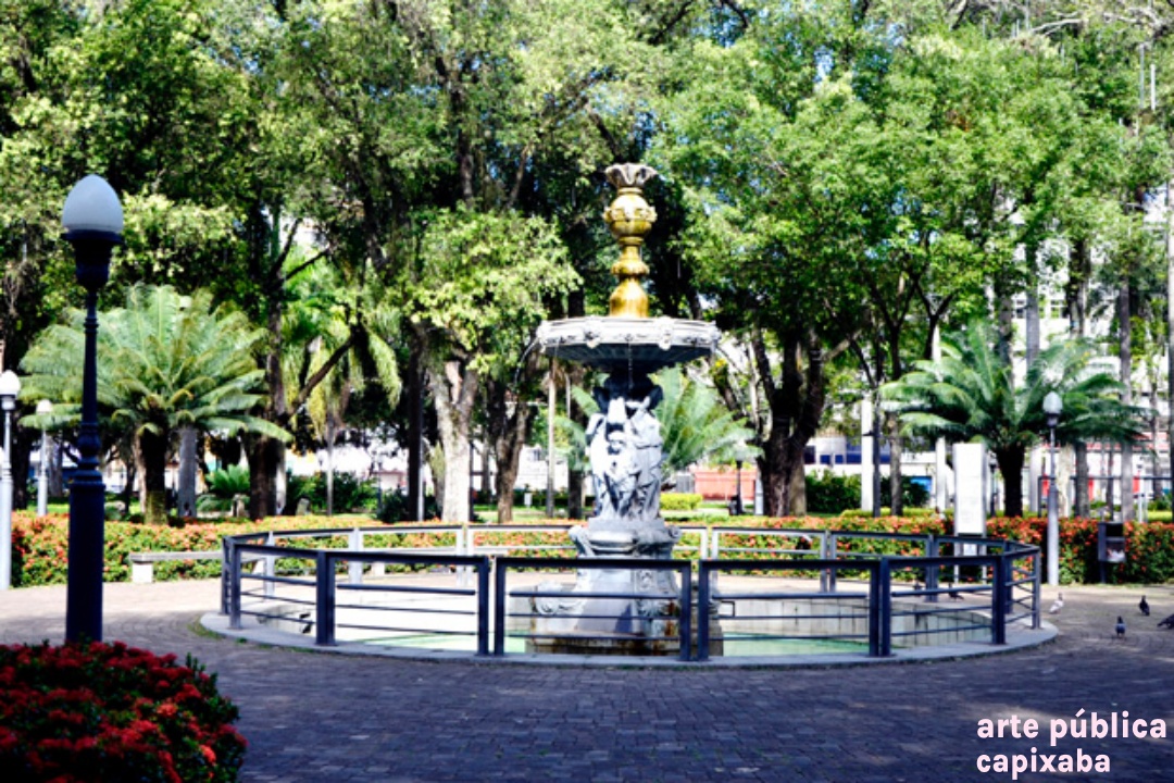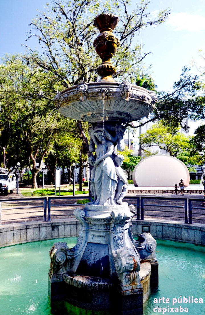 Chafariz com esculturas em antimônio (parte central), concreto modelado na parte superior e pedestal em concreto revestido com granito cinza, integra os elementos paisagísticos do Parque Moscoso, inaugurado em 1912 e homenageia o governante responsável pela obra, Jerônimo Monteiro. A obra, localizada na área interna do Parque Moscoso, faz parte do projeto original dessa importante área verde do Centro Histórico de Vitória. A parte artística é executada em antimônio (tipo de metal) e foi provavelmente escolhida por meio de catálogo e importada da firma Walter Macfarlane, sediada na Escócia. Sob as estátuas, em formato circular, há a inscrição em baixo relevo: "Ao Jeronymo Monteiro O povo Agradecido 1908-1912-Trabalha e Confia". Com as remodelações ocorridas no parque em 1952, a fonte foi transferida do seu local de origem, passando a ocupar uma área periférica (esquina da avenida República com a rua Padre José de Anchieta). Em 2001, com a requalificação dessa área, a fonte Jerónimo Monteiro voltou a destacar-se, por sua localização central, próxima ao seu local original (onde atualmente encontra-se a concha acústica). Foi restaurada em dezembro de 2019. O conjunto escultórico possui cerca de 5,50m de altura e diâmetro de 1,80m. CURIOSIDADES As fontes e chafarizes públicos sempre exerceram papel essencial na vida dos moradores de uma cidade colonial, como Vitória. Eles abasteciam de água potável as residências e comércios e minimizava o calor dos trópicos. A partir do século XIX, com a valorização do paisagismo, as fontes passaram a ser utilizadas para o embelezamento urbano. (1)