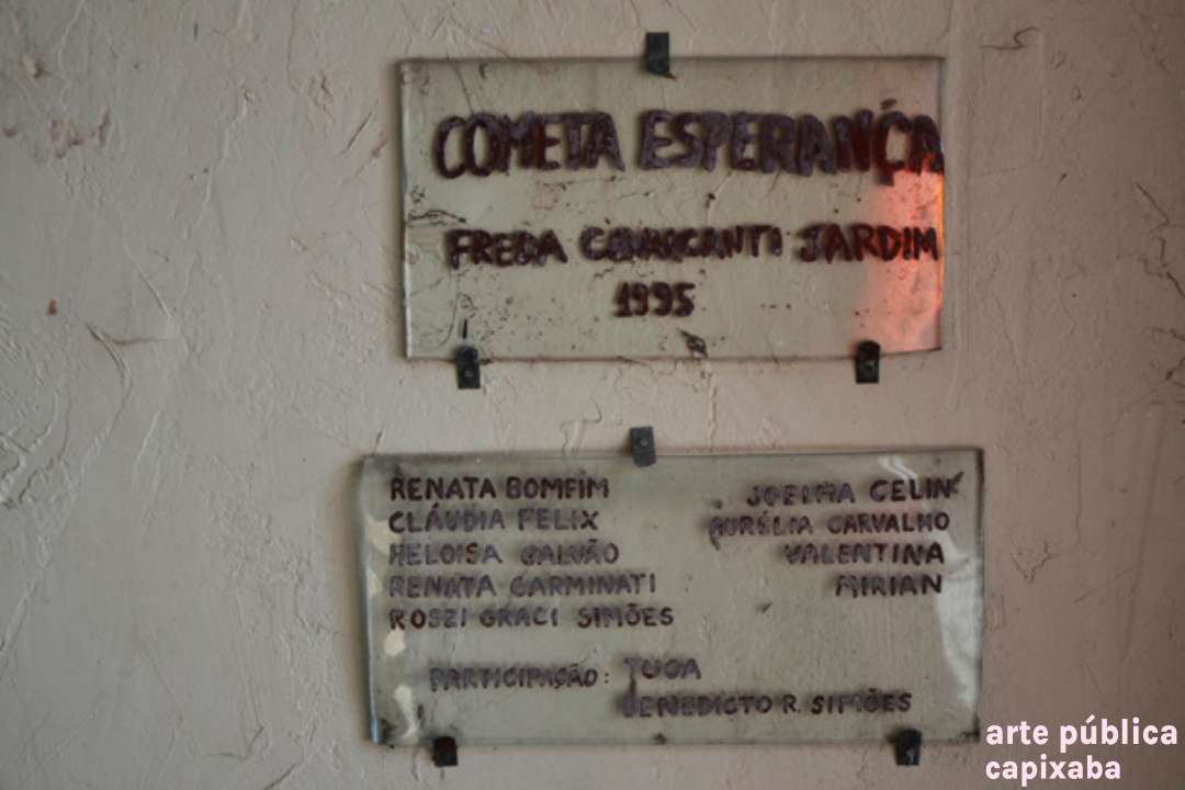 A obra feita pela artista cearense e ex-professora da UFES Freda Cavalcanti Jardim, foi resultado das atividades do grupo de trabalho conhecido como “Companhia do Mosaico” que executou vários projetos em mosaico no Estado. “Cometa esperança” é o resultado da participação de vários membros da Companhia como os alunos da UFES Renata Bomfim, Cláudia Felix, Heloisa Galvão, Renata Carminati, Roszi Graci Simões, Joelma Celin, Aurélia Carvalho, Valentina, Mirian e a intervenção de outros membros como Tuca e Benedito R. Simões. A técnica de mosaico usada é o método indireto, uma técnica que a artista Freda Jardim aprendeu durante uma etapa de formação em Ravena (Itália), que consiste em montar o sobre uma superfície provisória no ateliê e posteriormente se aplica à superfície definitiva. A obra apresenta uma luminária no centro da peça que se encaixa com a metáfora da obra como luz do cometa e da esperança. Iconograficamente representa um cometa com esteira decorada em tesselas de cor branca. No cometa aparece a figura de uma pomba branca deixando uma esteira de raios luminosos que simbolizariam a paz e a esperança. (2)