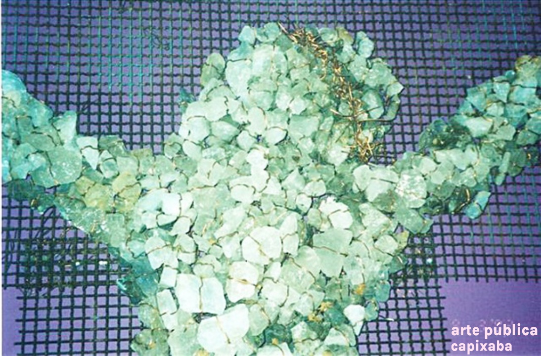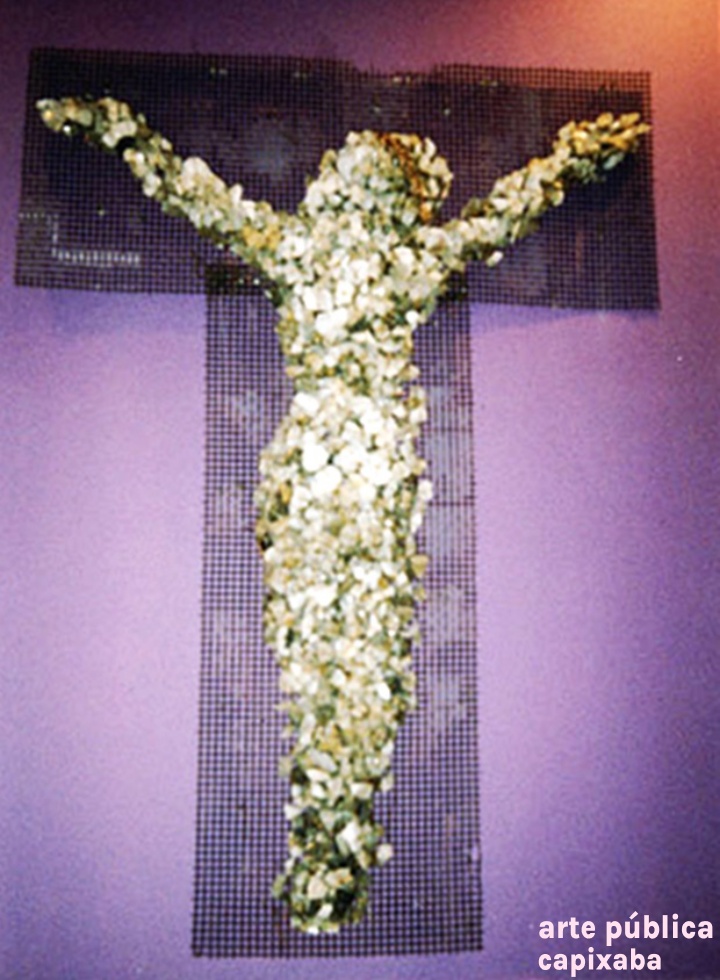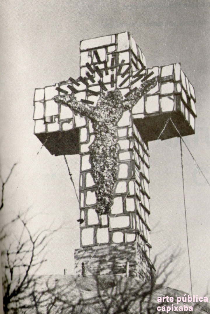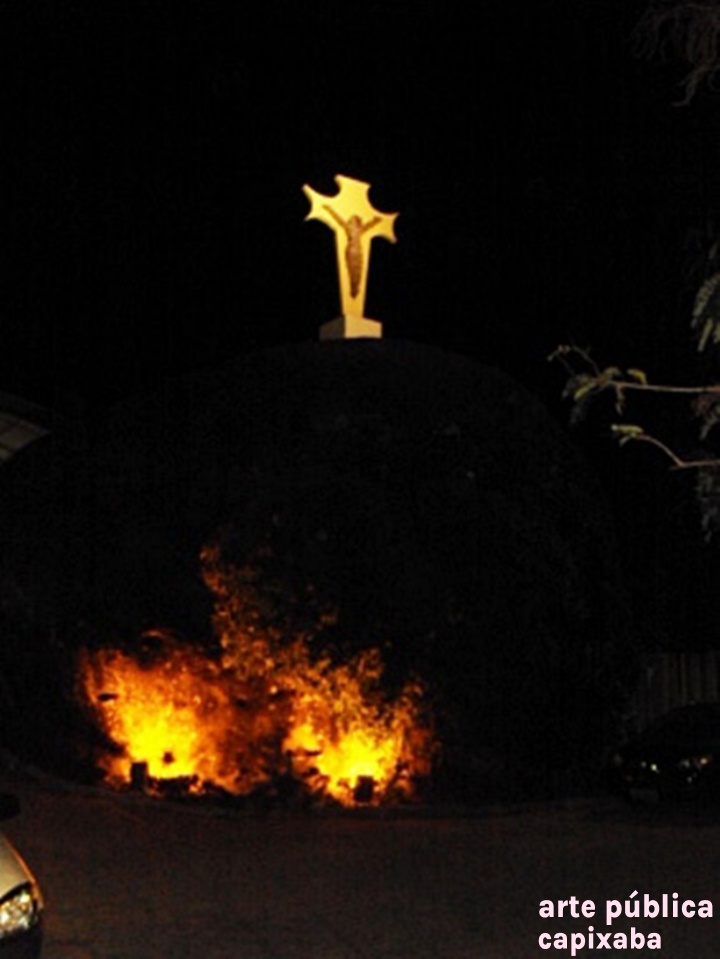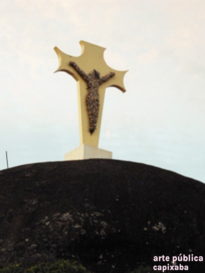 A cruz de sucata foi construída para homenagear a vinda do Papa João Paulo II a Vitória, em 1991, quando ele celebrou uma missa aqui mesmo onde fica a cruz e a escola. Foi projetada pela famosa artista plástica e professora de artes da UFES, Freda Cavalcanti Jardim. Ela era feita de pedaços de madeira, para representar os barracos do nosso bairro, no passado. Tem um Cristo de pedaços de cristais amarrados com fios de cobre. A cruz media 5 metros de altura e 3 metros de largura. Em 2002, a cruz sofreu modificações, pois suas tábuas estavam estragadas. Ela foi restaurada pelos ex-alunos da professora Freda que a pedido da comunidade, seria em lajotas e sem reboco, representando a situação do bairro Nova Palestina. O Cristo de cristal nesse período ficou exposto na UFES alguns meses, dai veio a surpresa de uma cruz de concreto, rebocada e pintada, levando ao fim a história de um monumento do bairro Nova Palestina. No início, quando ela foi feita, era o registro de um monumento da realidade, representava lutas e vidas, esperança de um futuro, evocação de humildes barracos. E hoje? (2)