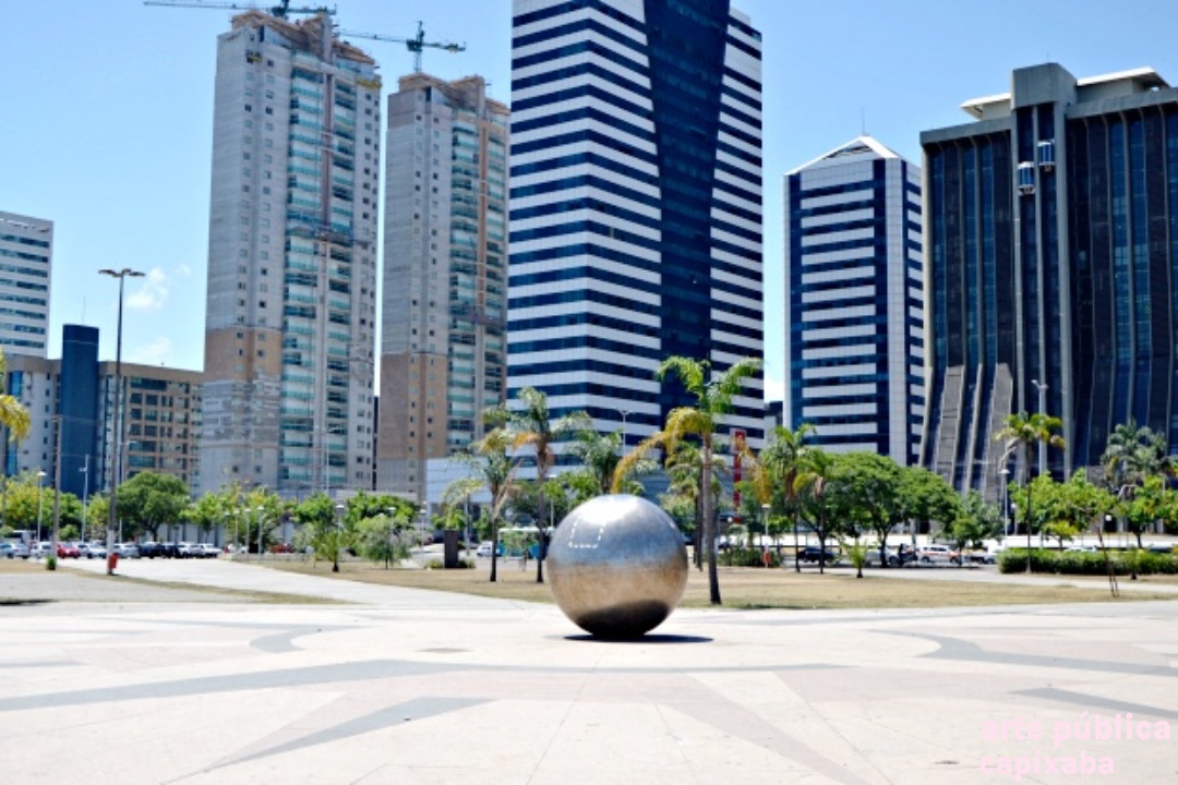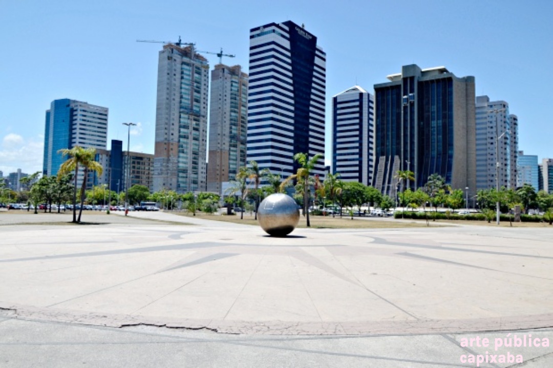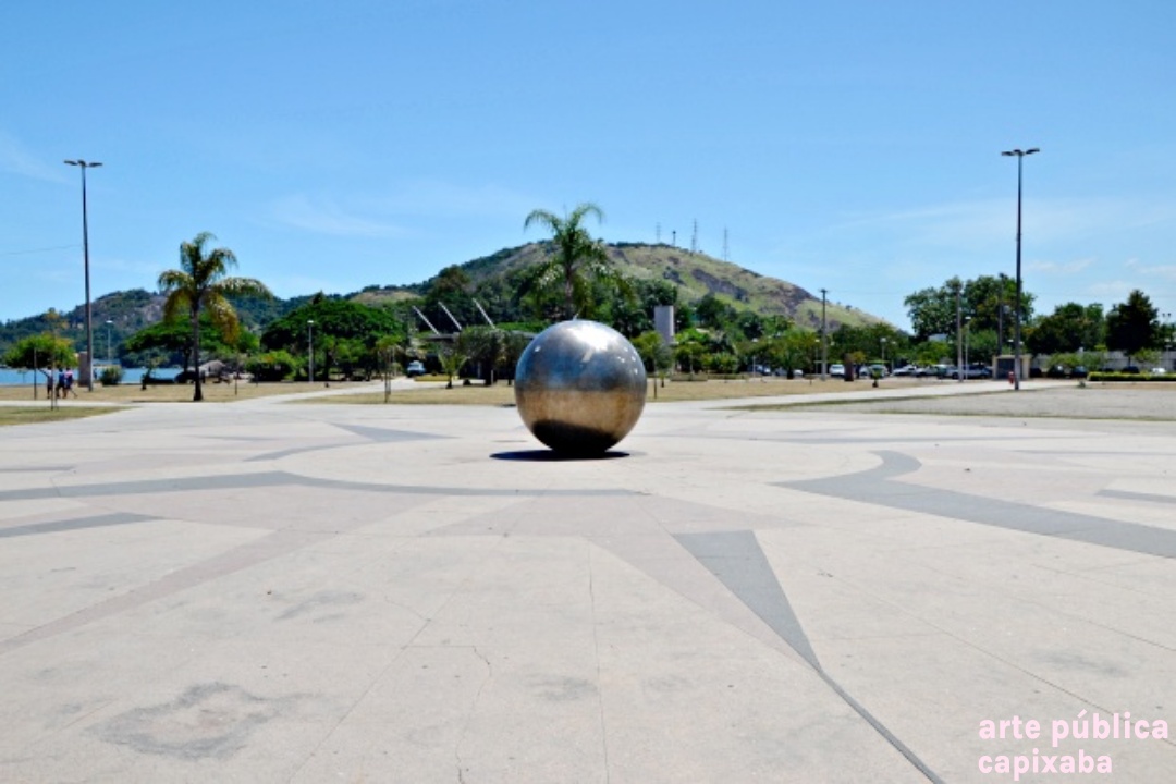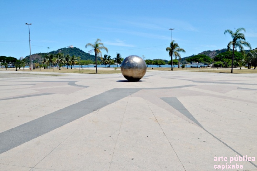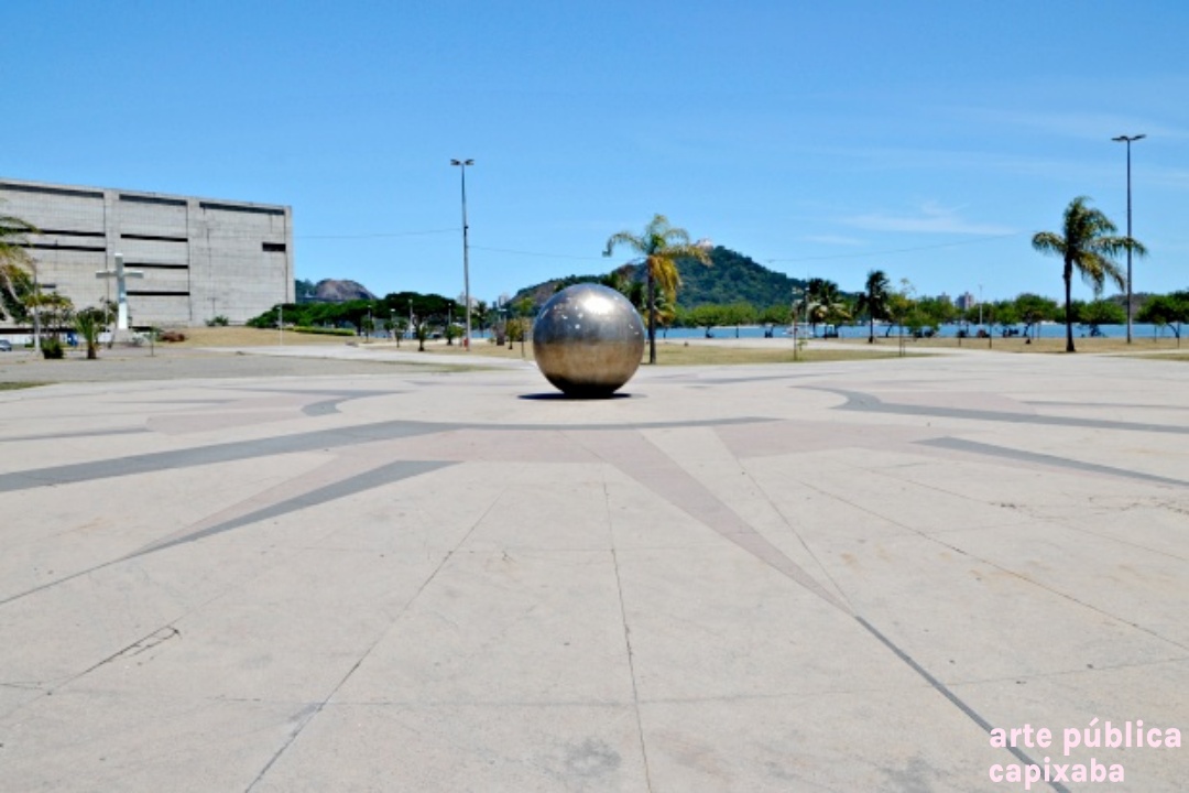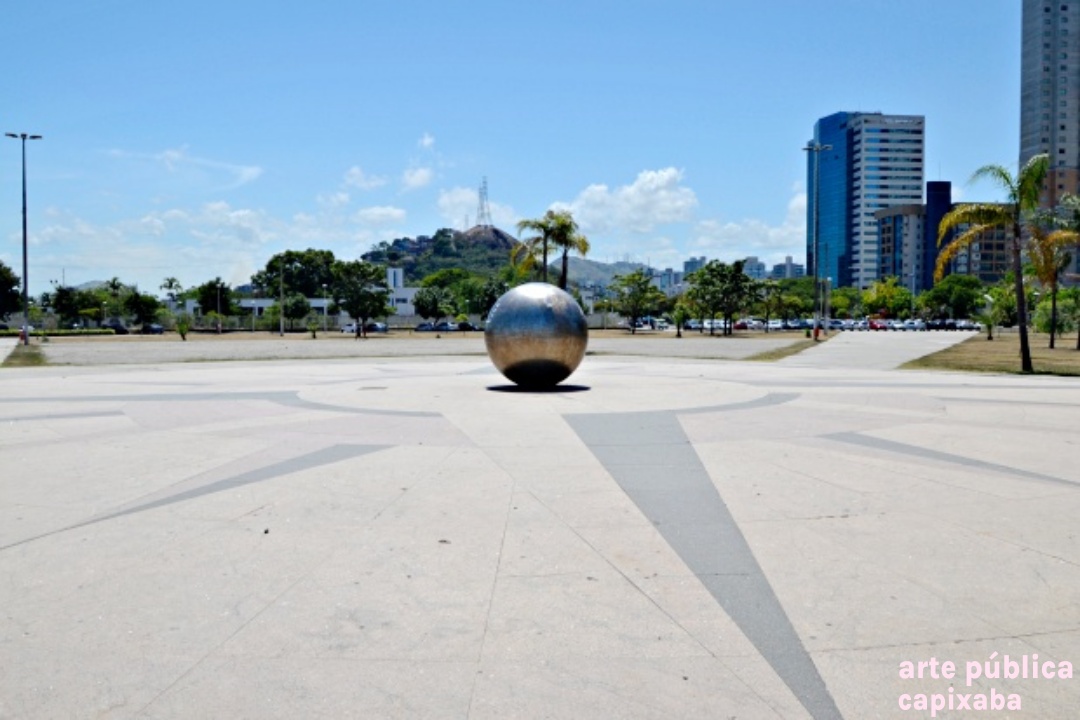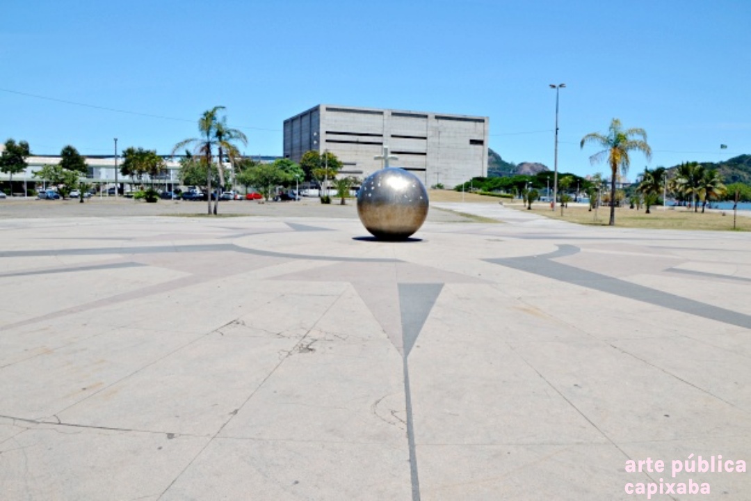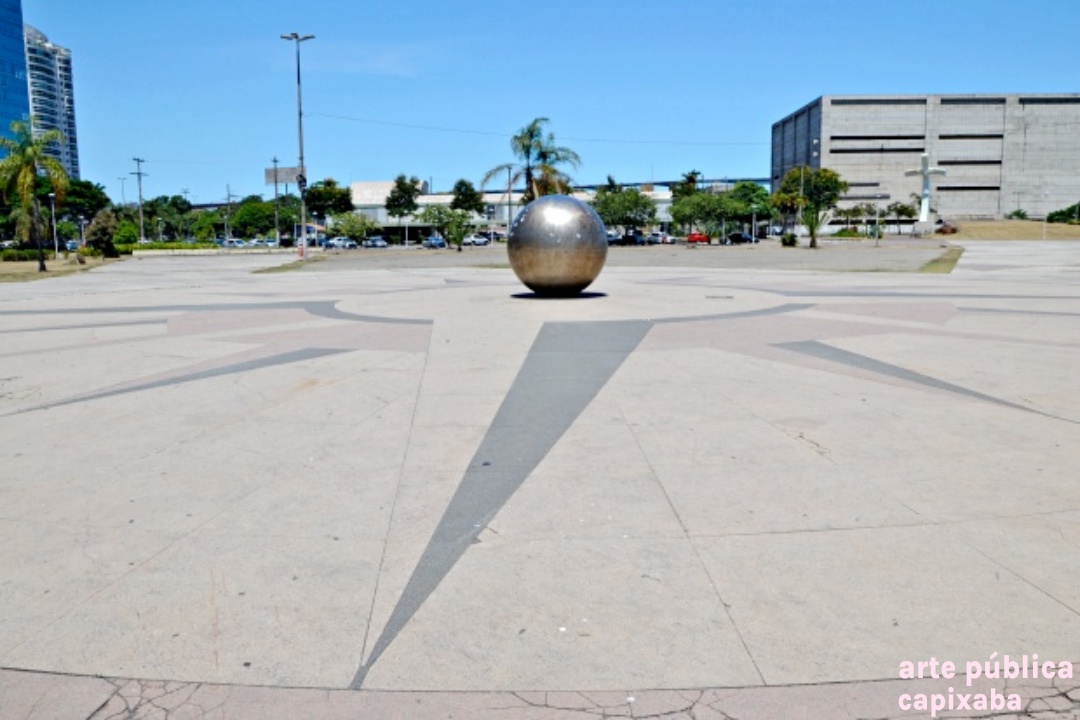 Rosa dos ventos na paginação do piso, executado por placas de granito vermelho, amarelo e preto, em cujo centro encontra-se uma esfera de aço inox polido.