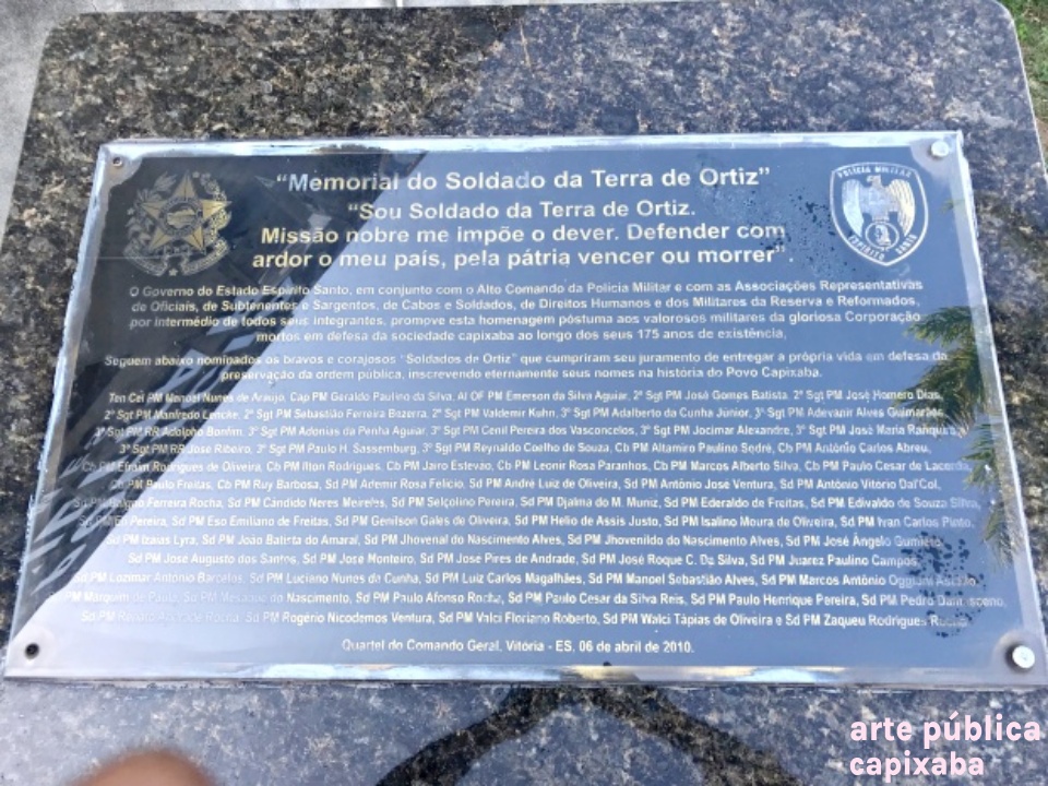 Lê-se: ""Memorial do Soldado da Terra de Ortiz" "Sou Soldado da Terra de Ortiz. Missão nobre me impõe o dever. Defender com ardor o meu país, pela pátria vencer ou morrer" O Governo do Estado Espirito Santo, em conjunto com o Alto Comando da Policia Militar e com as Associações Representativas de Oficiais, de Subtenentes e Sargentos, de Cabos e Soldados, de Diretos Humanos e dos Militares da Reserva e Reformados, por intermédio de todos seus integrantes, promove esta homenagem póstuma aos valorosos militares da gloriosa Corporação mortos em defesa da sociedade capixaba ao longo dos seus 175 anos de existência. Seguem abaixo nominados os bravos e corajosos "Soldados de Ortis" que cumpriram seu juramento de entregar a própria vida em defesa da preservação da ordem pública, inscrevendo eternamente seus nomes na historia do Povo Capixaba. .................................. Quartel do Comando Geral. Vitoria-ES. 06 de abril de 2010."