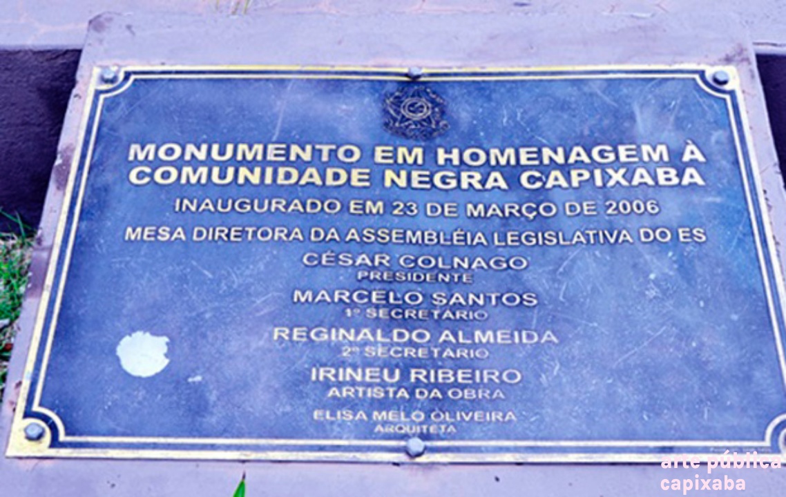 Monumento em homenagem à comunidade negra capixaba. Inaugurado em 23 de março de 2006. Mesa diretora da Assembleia Legislativa do ES. Cesar Colnago Presidente Marcelo Santos 1º Secretário Reginaldo Almeida 2º Secretário Irineu Ribeiro Artista da obra Elisa Melo Oliveira Arquiteta