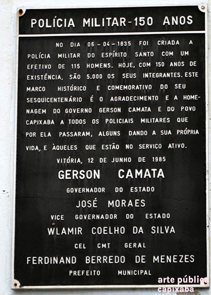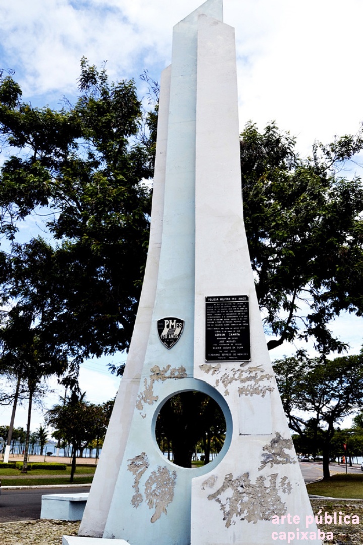 Sobre a Polícia Militar do Espírito Santo: A criação da Polícia Militar do Espírito Santo se deu por meio da Lei Provincial nº 09, de 06 de abril de 1835. Tal lei foi sancionada pelo presidente da província, Manoel José Pires da Silva Pontes. Diante do cenário de turbulências e revoltas que acometiam o país na ocasião, ele reorganizou sua força militar, criando a Companhia de Guarda de Polícia Provincial. Essa foi a primeira denominação da Polícia Militar do Espírito Santo. No monumento há também uma placa em bronze com a seguinte Inscrição: "Polícia Militar - 150 anos. No dia 6-4-1835 foi criada a Polícia Militar do Espirito Santo com um efetivo de 115 homens. Hoje, com 150 anos de existência, são 5.000 os seus integrantes. Este marco histórico e comemorativo do seu dia sesquicentenário é o agradecimento e a homenagem do governo Gerson Camata e do povo capixaba a todos os policiais militares que por ela passaram, alguns dando a sua própria vida, "e àqueles que estão no serviço ativo. Vitória, 12 de Junho de 1985 | Gerson Camata - Governador do Estado | José Moraes - Vice-Governador do Estado | Wlamir Coelho da Silva - CEL CMT geral I Ferdinand Berredo de Menezes - Prefeito Municipal" O original do decreto de criação da PMES e fotos antigas da Instituição estão disponíveis para consulta no acervo do Arquivo Público do Estado do Espírito Santo. (1)