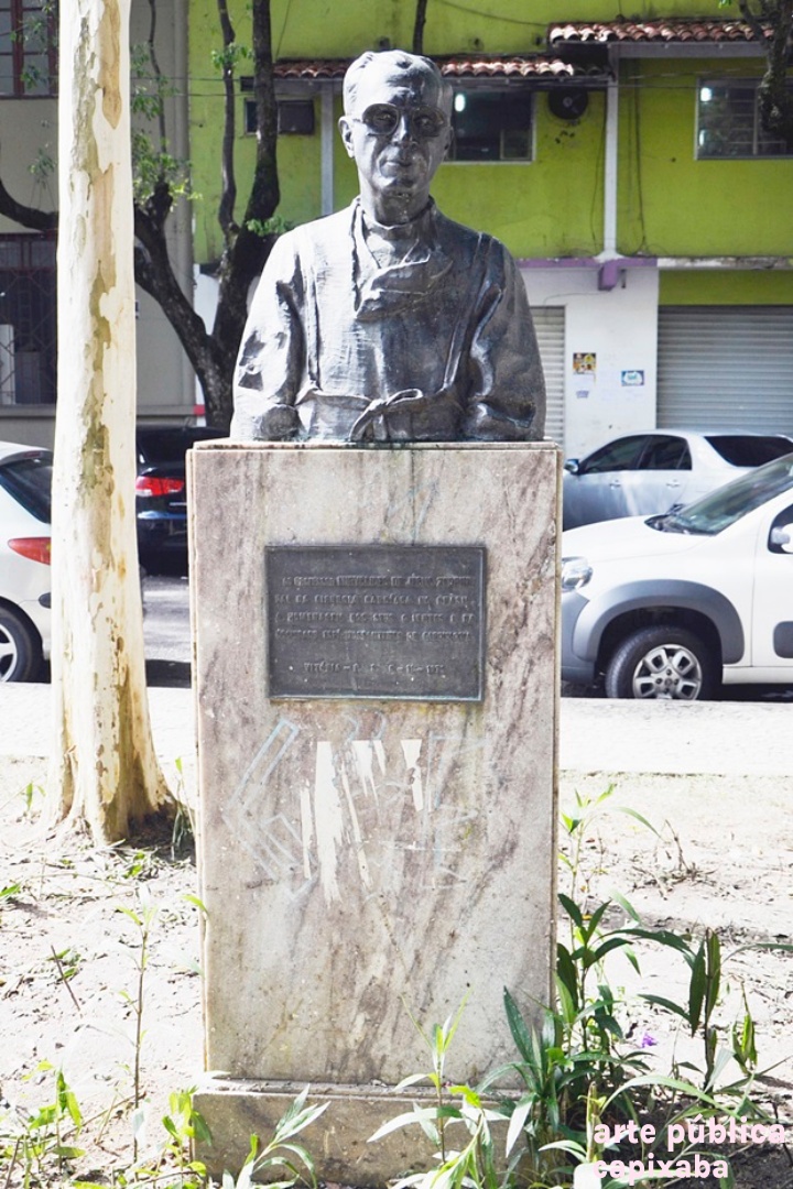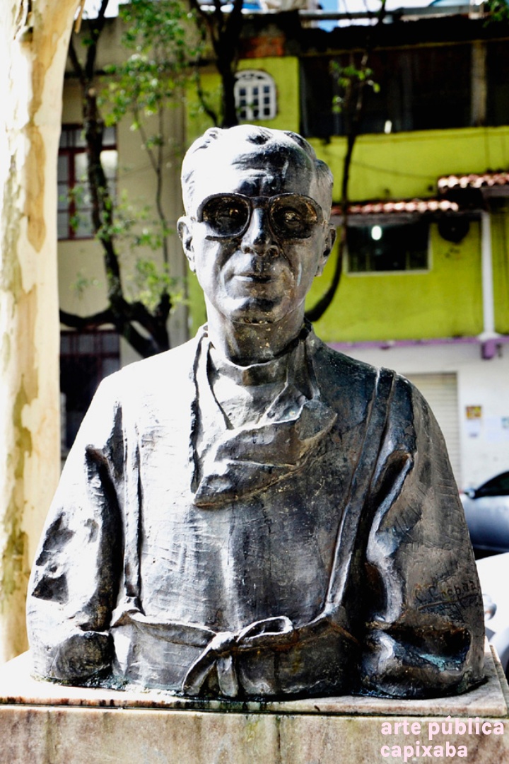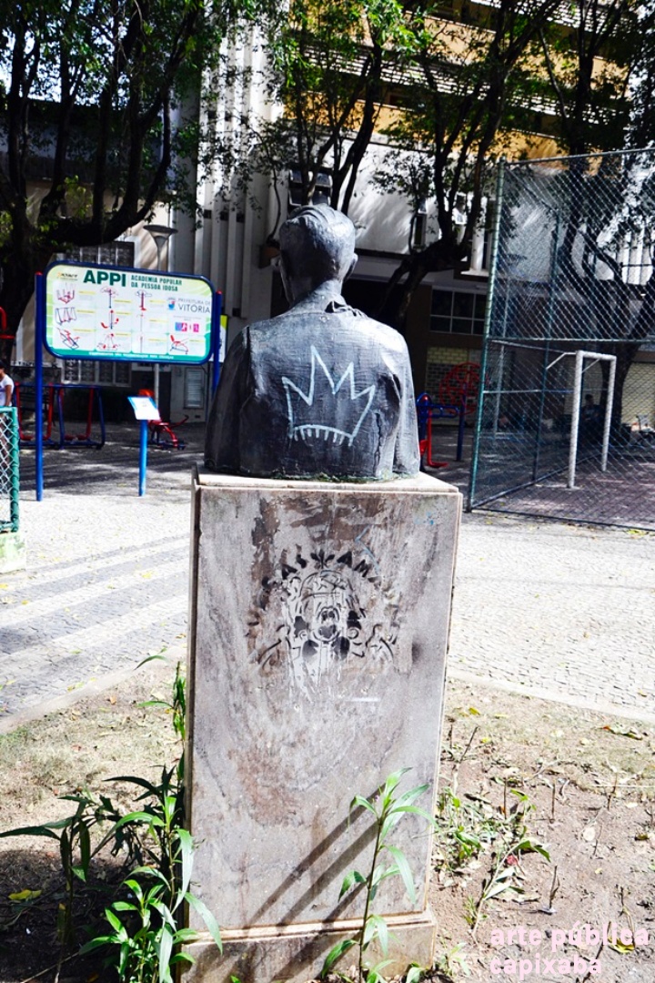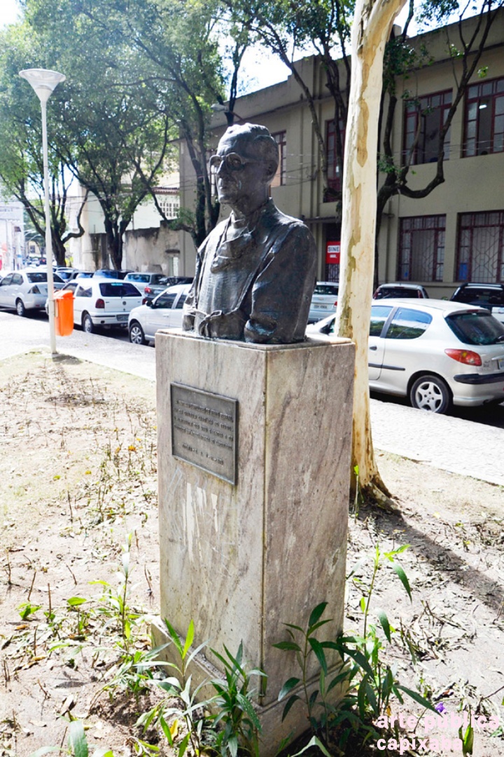 Bronze sobre pedestal de concreto revestido em granito cinza polido.