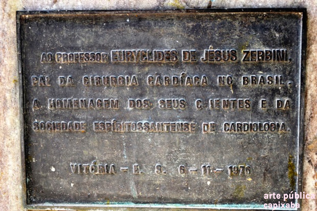 Lê-se: "Ao Professor Euryclides de Jesus Zerbini, pai da cirurgia cardíaca no Brasil, a homenagem dos seus clientes e da sociedade espírito-santense de cardiologia. Vitória - E.S. 6-11 -1976"