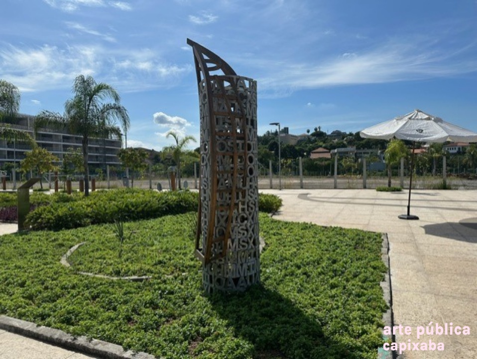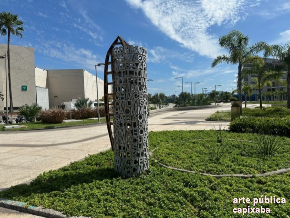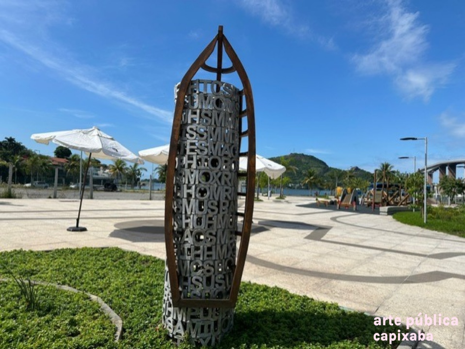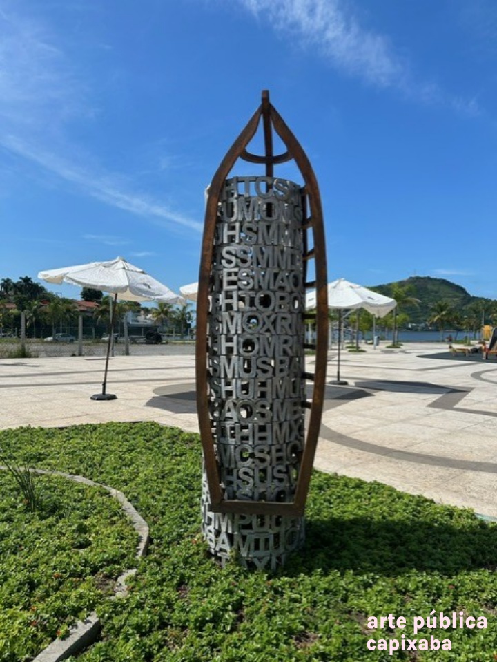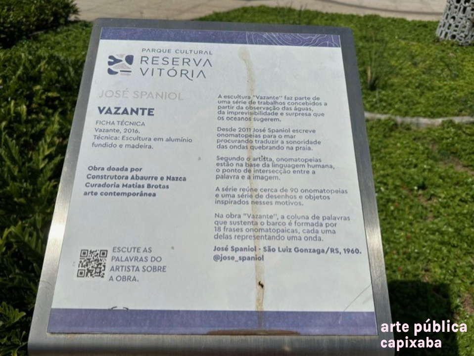 Lê-se: "JOSÉ SPANIOL VAZANTE FICHA TÉCNICA Vazante, 2016. Técnica: Escultura em alumínio fundido e madeira. Obra doada por Construtora Abaurre e Nazca Curadoria Matias Brotas arte contemporânea A escultura "Vazante" faz parte de uma série de trabalhos concebidos a partir da observação das águas, da imprevisibilidade e surpresa que os oceanos sugerem. Desde 2011 José Spaniol escreve onomatopeias para o mar procurando traduzir a sonoridade das ondas quebrando na praia. Segunda pago da linguagem humana, o ponto de intersecção entre a palavra e a imagem. A série reúne cerca de 90 onomatopeias e uma série de desenhos e objetos inspirados nesses motivos. Na obra "Vazante", a coluna de palavras que sustenta o barco é formada por 18 frases onomatopaicas, cada uma delas representando uma onda. José Spaniol - São Luiz Gonzaga/ RS, 1960. @jose_spaniol"